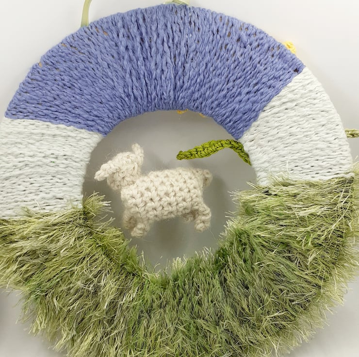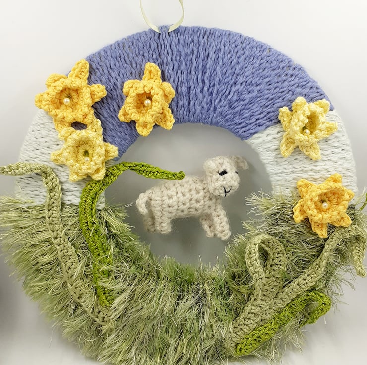 This cheerful wreath is made from two layers of sturdy card which have been wrapped in cotton yarn and a green eyelash yarn. It is decorated with daffodils crocheted in cotton with a pistil made from a glass bugle bead and a faux pearl. The spring lamb is crocheted from alpaca wool and filled with polyester stuffing. It hangs freely in the centre of the wreath from an invisible thread so that if it moves it appears to be gambolling in the distance!