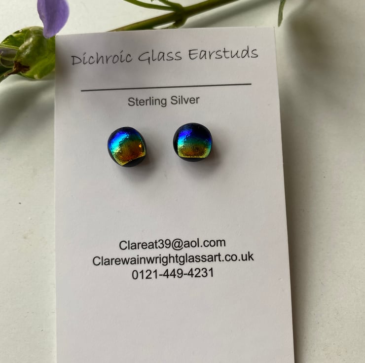 A beautiful pair of fused glass earrings. They have been made using a rainbow dichroic glass which has a different transmitted and reflected colour giving a gorgeous effect when looked at from different angles .