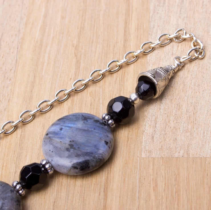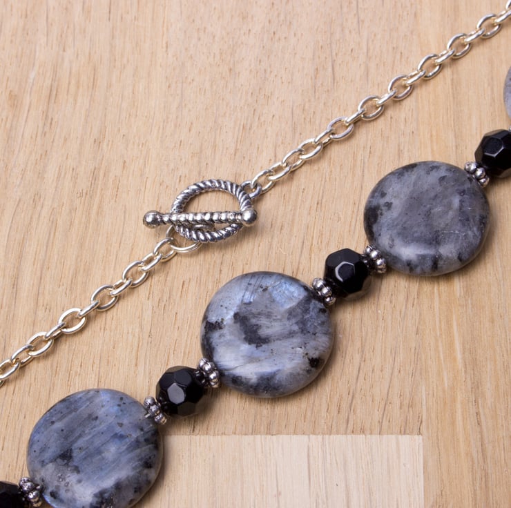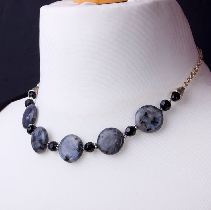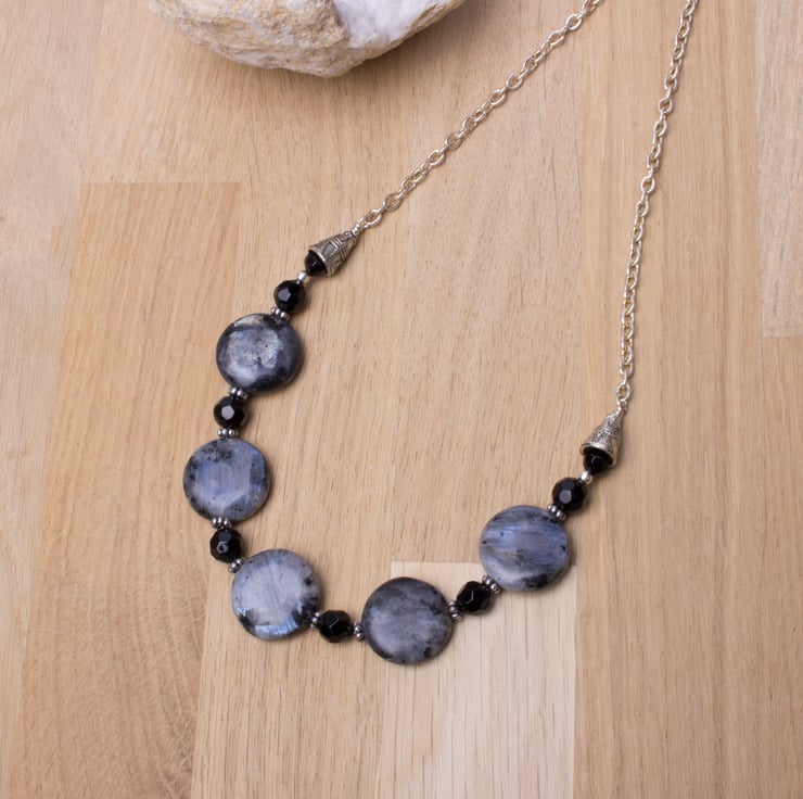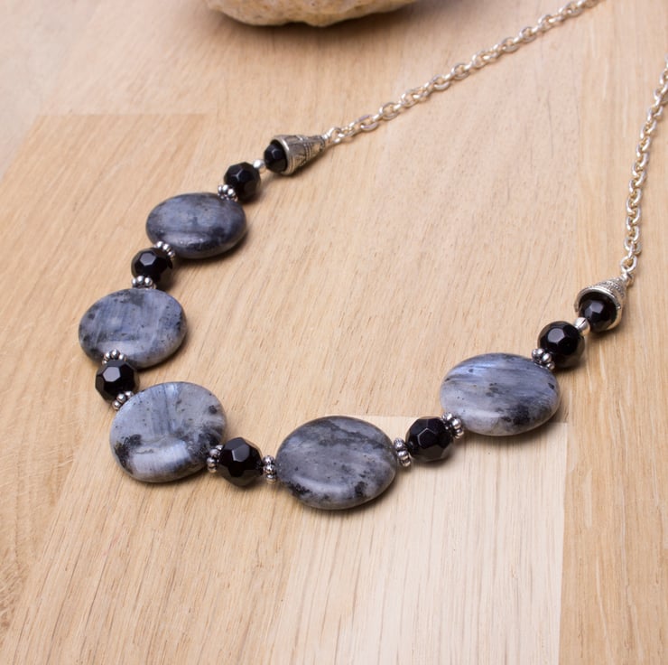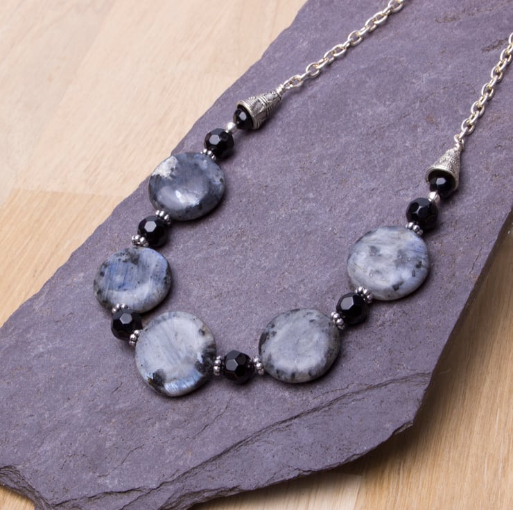 Larvikite coin bead necklace - natural grey stone with blue flashes, black bead and chain necklace