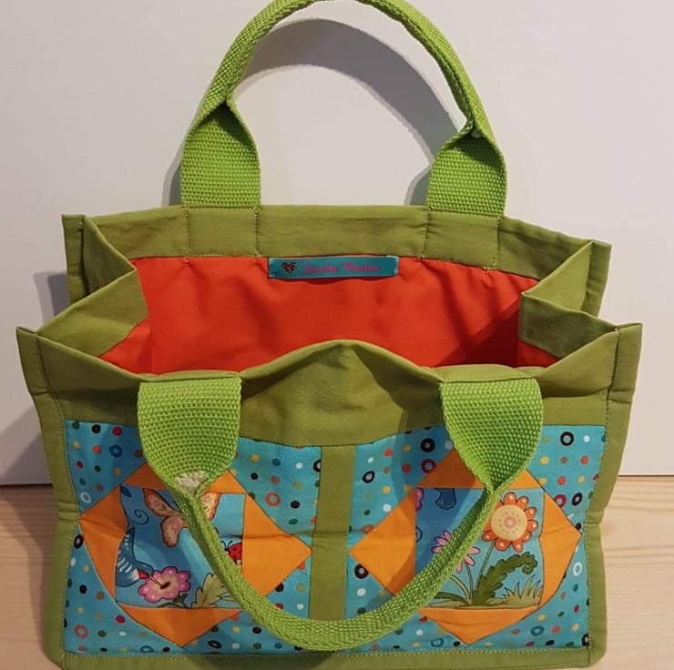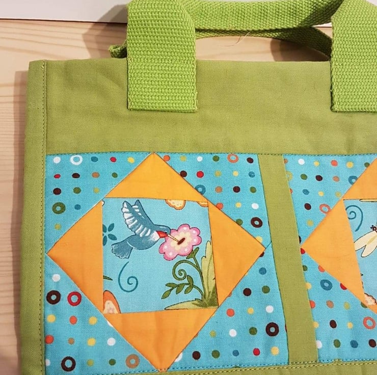 The main color is lime green combined with bright orange and turquise. The very cute patterns are content hummingbird, dragonfly,ladybug ,butterfly and flowers. The bag made from cotton and polycotton fabrics outside,and bright orange waterproof lining inside.Dimensions: width: 26cm,hight:18cm,depth:12cm. The handles are 28cm long,made from cotton webbing with cord inner on the top.