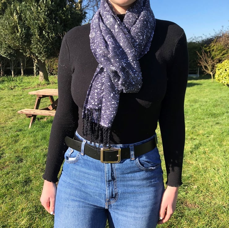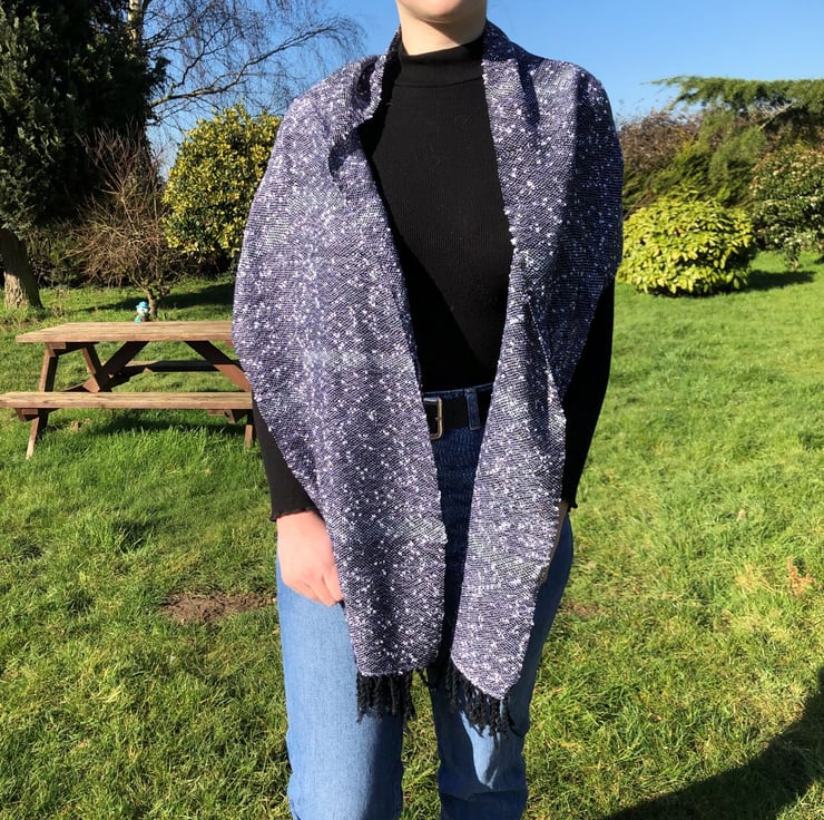 The purple Sparkle is a lightweight pashmina scarf handwoven with an acrylic purple/lilac and white textured yarn with a white and silver textured yarn stripe, making a slight glitter accent.