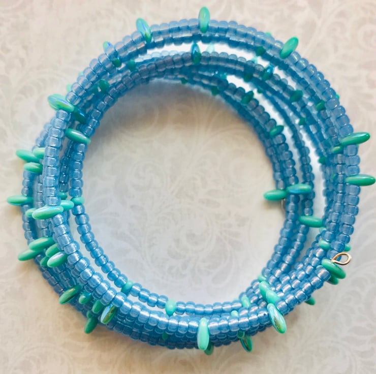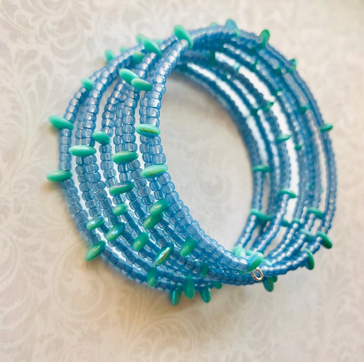 Vine and leaf beaded memory wire statement bracelet. Made with silver lined blue seed beads & pale green ab droplet beads.