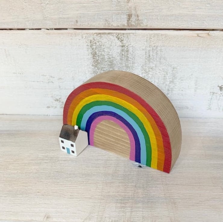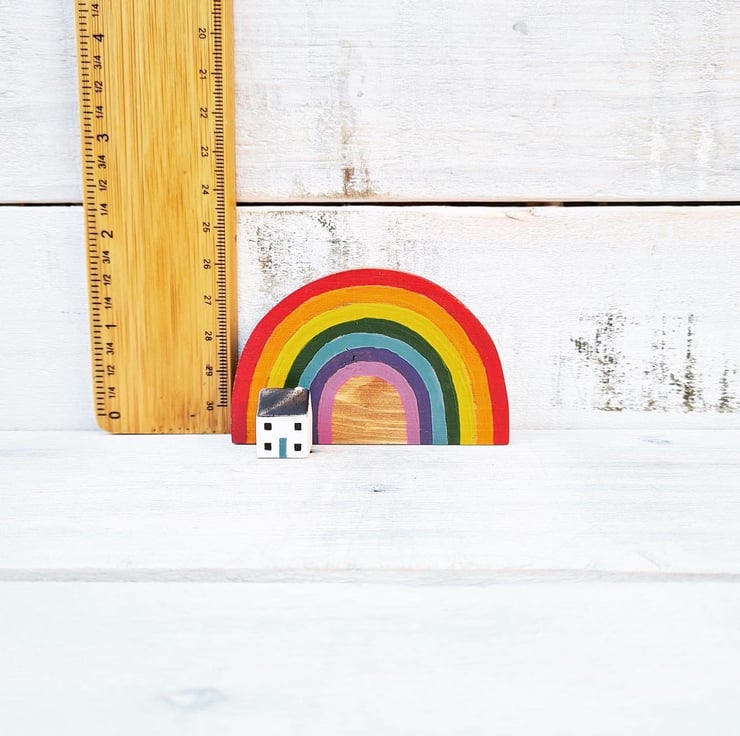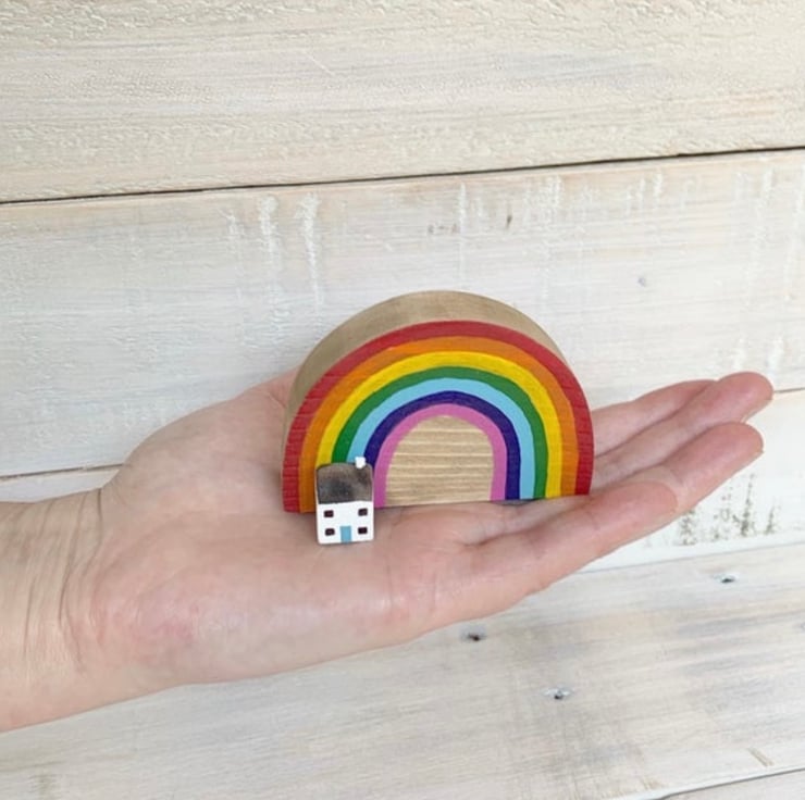 This teeny cottage sits by a hand painted wooden rainbow... perfect!