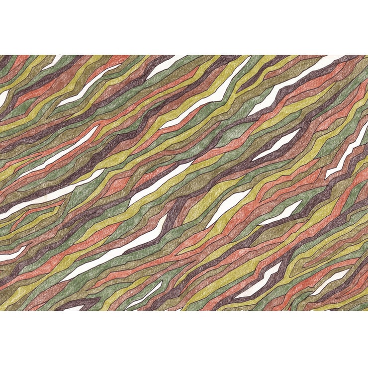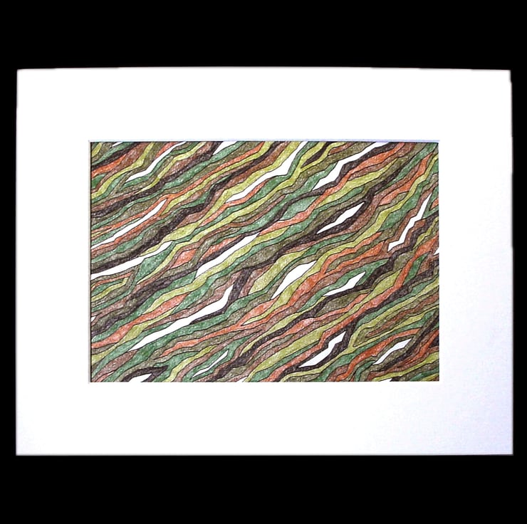 This is a unique original drawing in coloured pencils. This series of designs originated in the patterns formed by leaves in my garden but quickly evolved into the concept of ribbons, joining and re-joining. This drawing stays with the natural colours of greens and browns, the ribbons meeting and moving diagonally across the page with small breaks or gaps where the paper shows white. I find that everyone brings their own interpretation to these drawings.