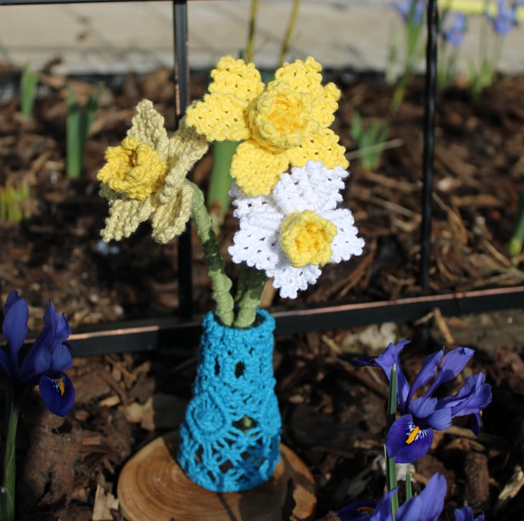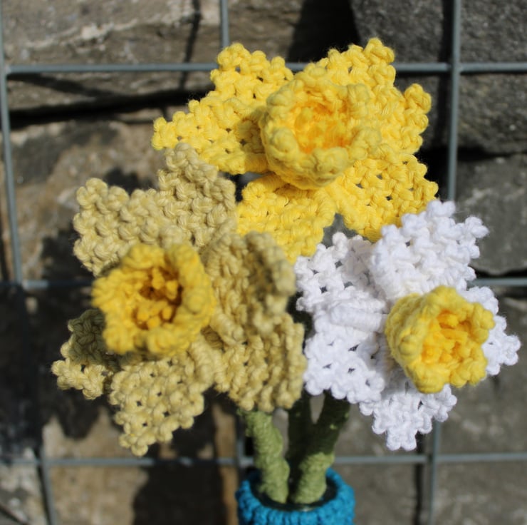 A trio of everlasting spring daffodils that will not die after a couple of weeks but can be enjoyed throughout the year. They have been made from macrame in a variety of different yellows and white using a combination of recycled cotton yarns and cotton bakers twine. Each petal has been individually knotted by hand, then gathered together along with the trumpet and wrapped to form the stem.