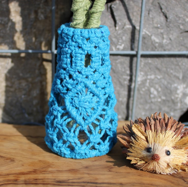 The vase is an upcycled diffuser bottle which has been wrapped in a decorative macramé cover. The colour of vase casing is a bold Eton Blue in contrast to the flowers and makes them stand out..