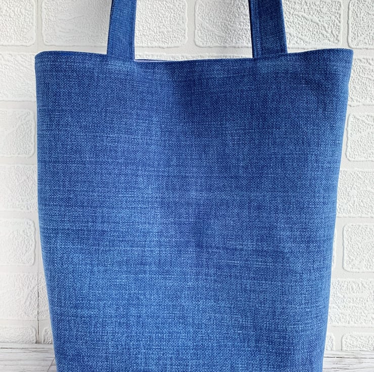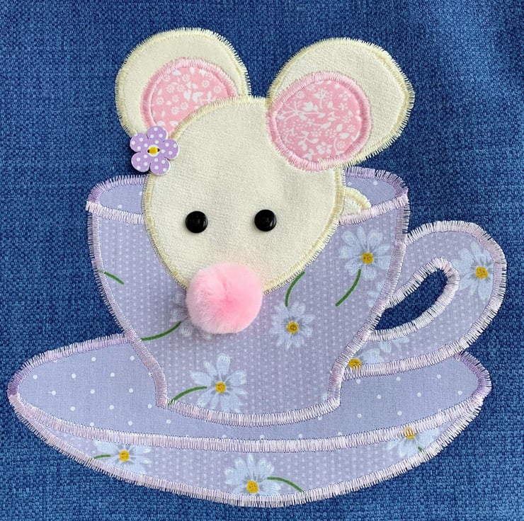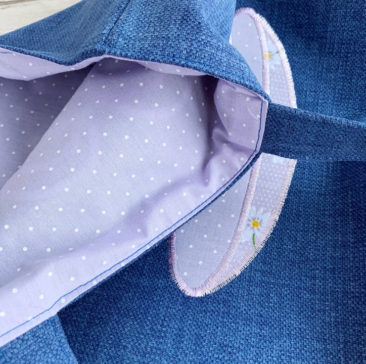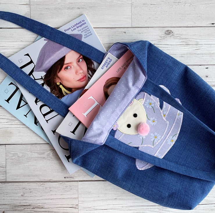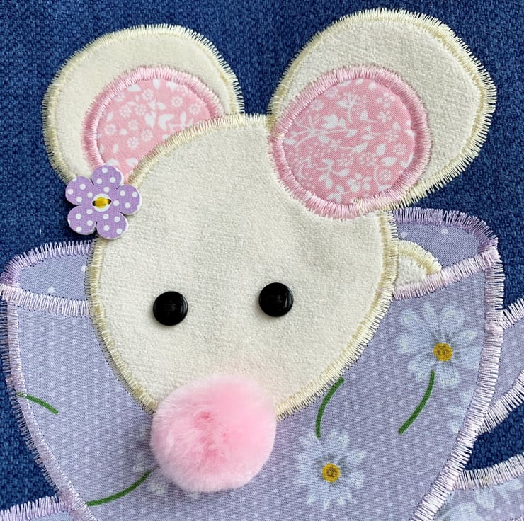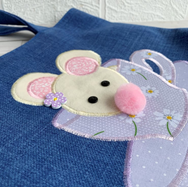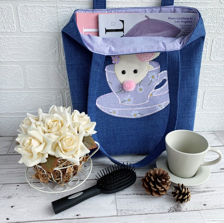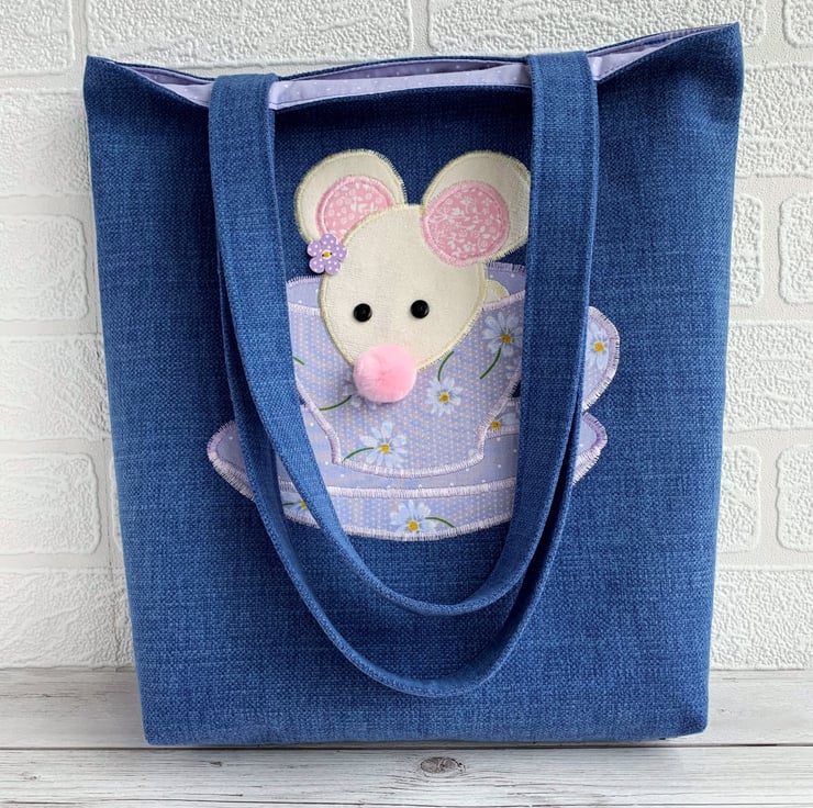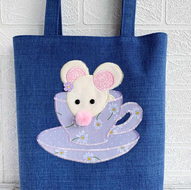 Mouse in a teacup tote bag. The tote bag is made from sturdy blue fabric and has an appliqué design depicting a cup and saucer with a cute mouse peeping out of the cup. The cup and saucer are made from pretty print fabric in lilac with a pattern of white and yellow daisies and white polka dots. The insides of the cup and saucer are made from lilac fabric with white polka dots. The mouse is made from cream velvet and her ears are made from pale pink fabric with a ditsy white floral print pattern. She has black button eyes and a nose made from a fluffy pale pink pompom. The mouse is sporting a flower, which is a wooden flower shaped button in lilac with white polka dots. The bag is lined with the same lilac polka dot fabric that the insides of the cup and saucer are made from.