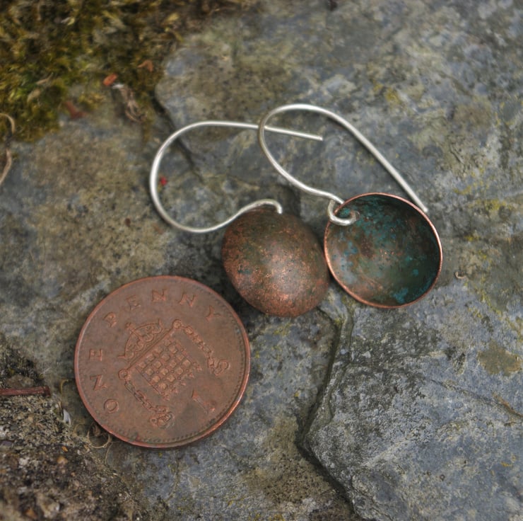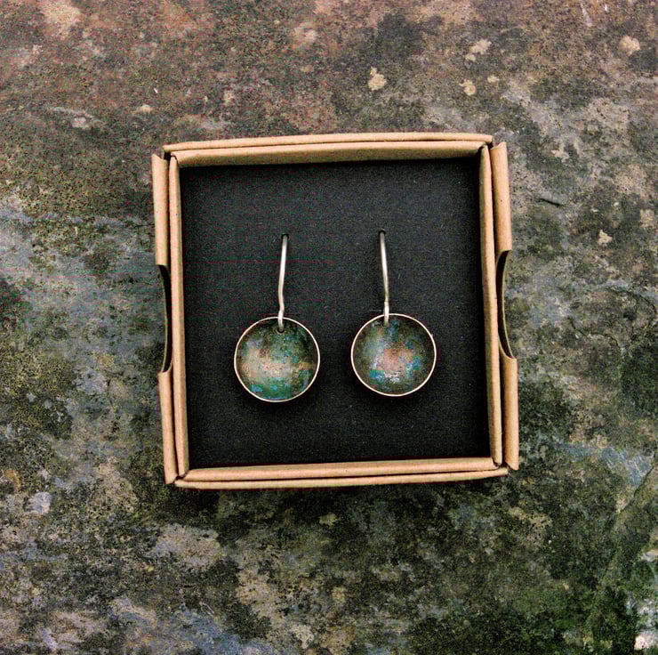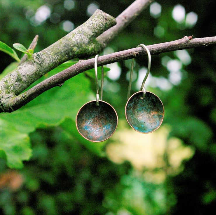 I have cut out circles from recycled copper and domed them and created verdigris shades of dark green, with a hint of deep turquoise and burnished copper. The colours are brighter in the light and the shiny copper edges make a lovely contrast.