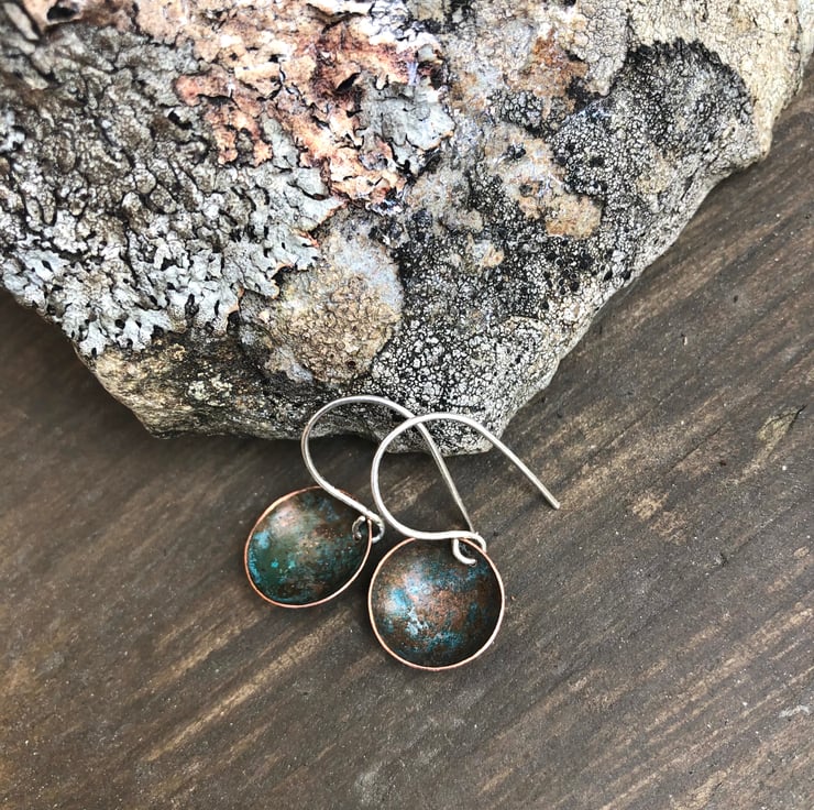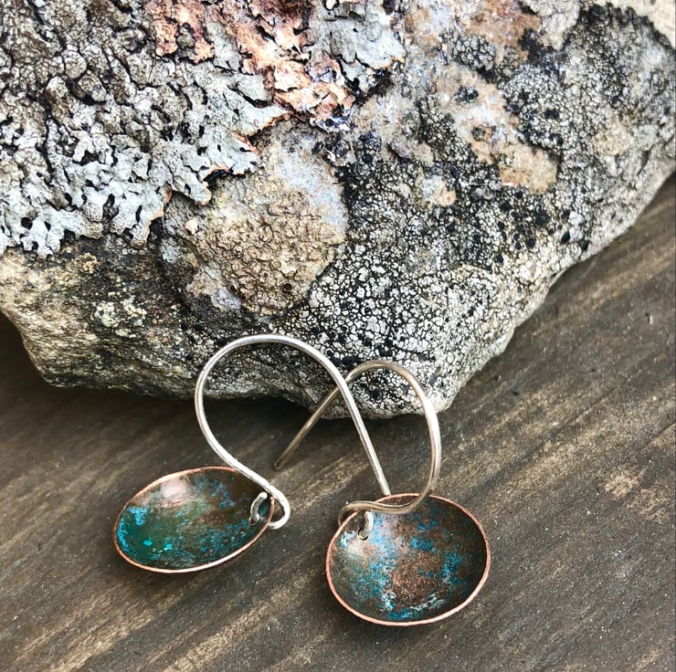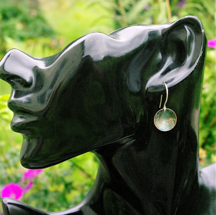 The discs hang from a handmade eco sterling silver ear hook. The verdigris is preserved with a matt sealer.