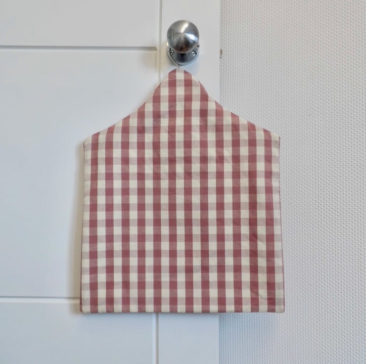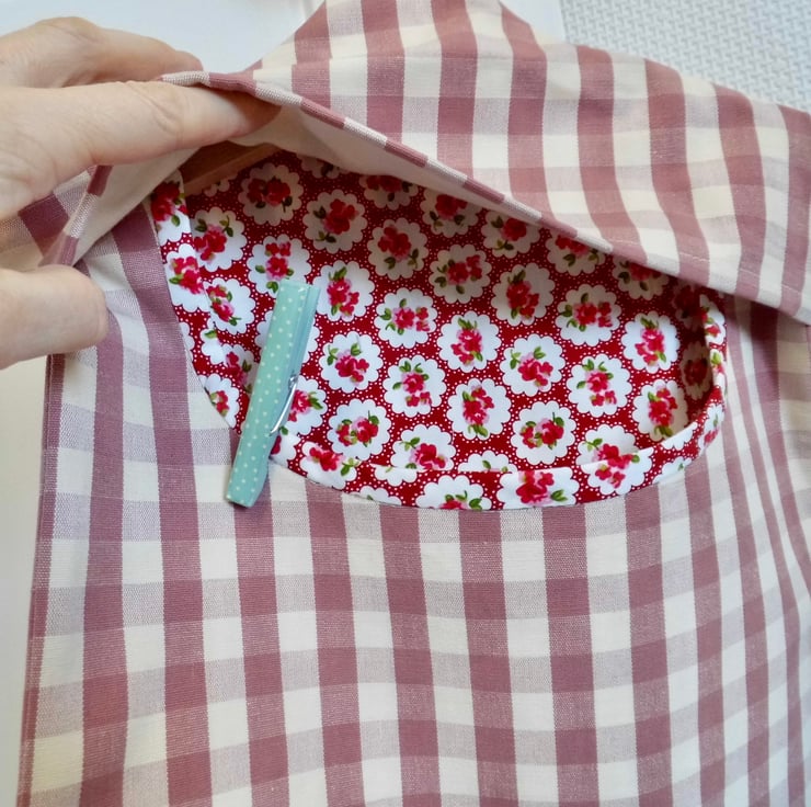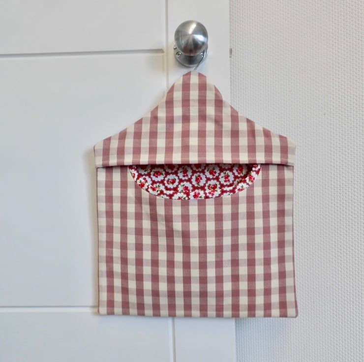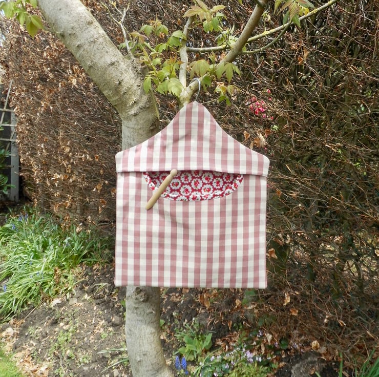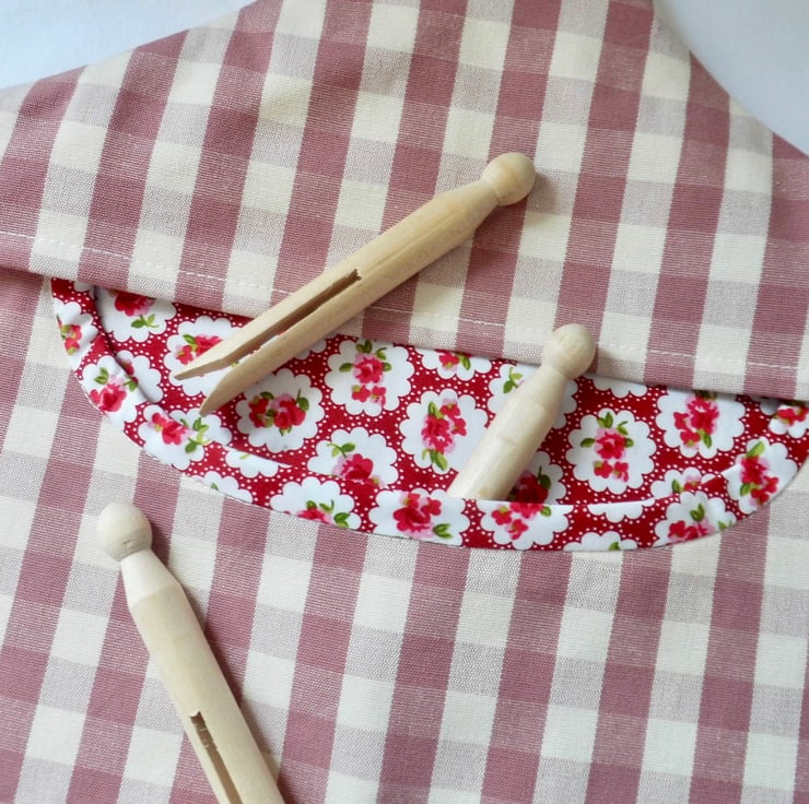 A fully lined peg bag carefully made using a raspberry pink and cream gingham. The back is lined with a red bubble rose printed cotton and you can see this through the opening. The front is lined with cream cotton fabric.