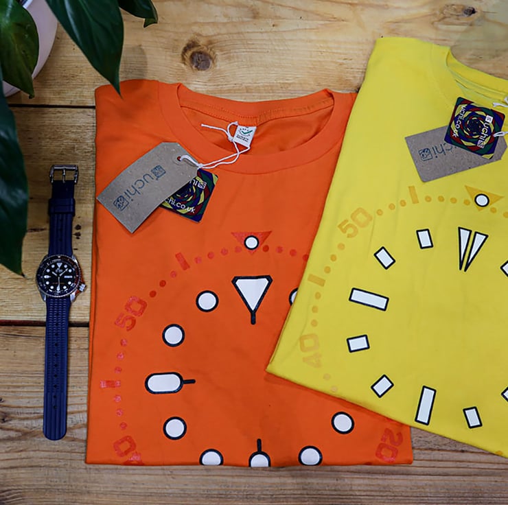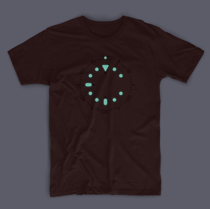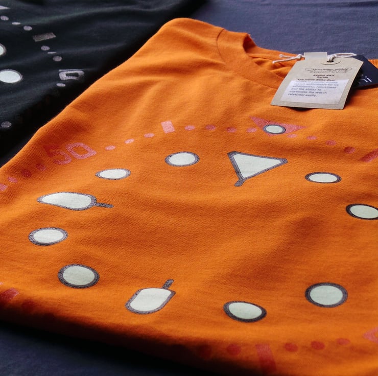 Carefully hand screen printed T shirts using no less than four separate screens to accurately capture the iconic SKX011 watch face. Using clear ink to subtly capture Seiko's recognisable SKX bezel and the iconic SKX lume printed using glow-in-the-dark luminescent ink.
