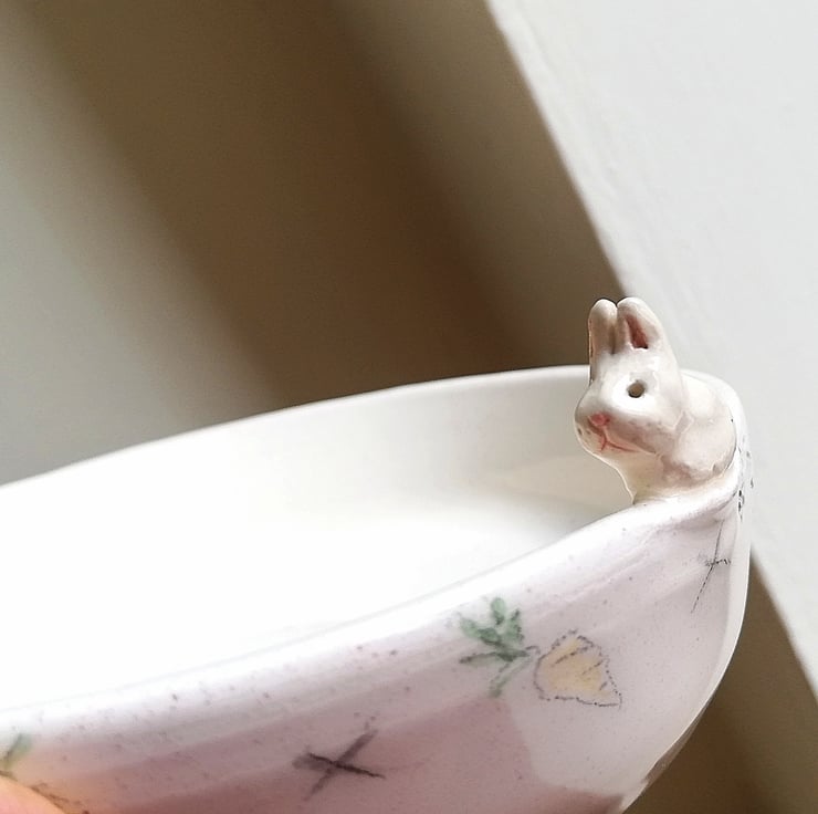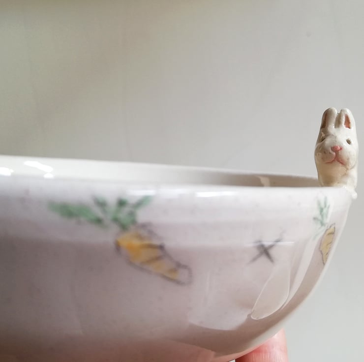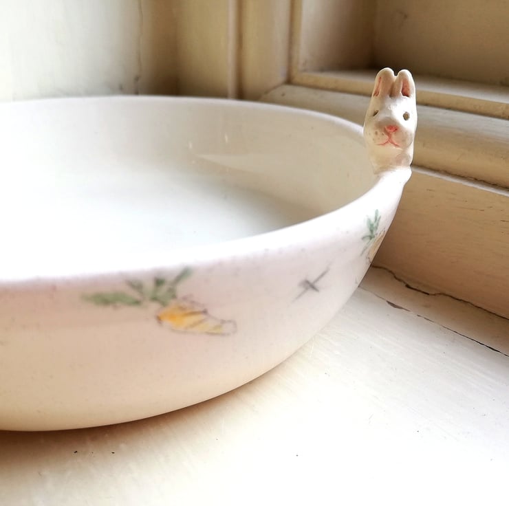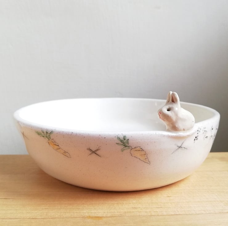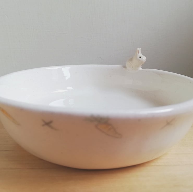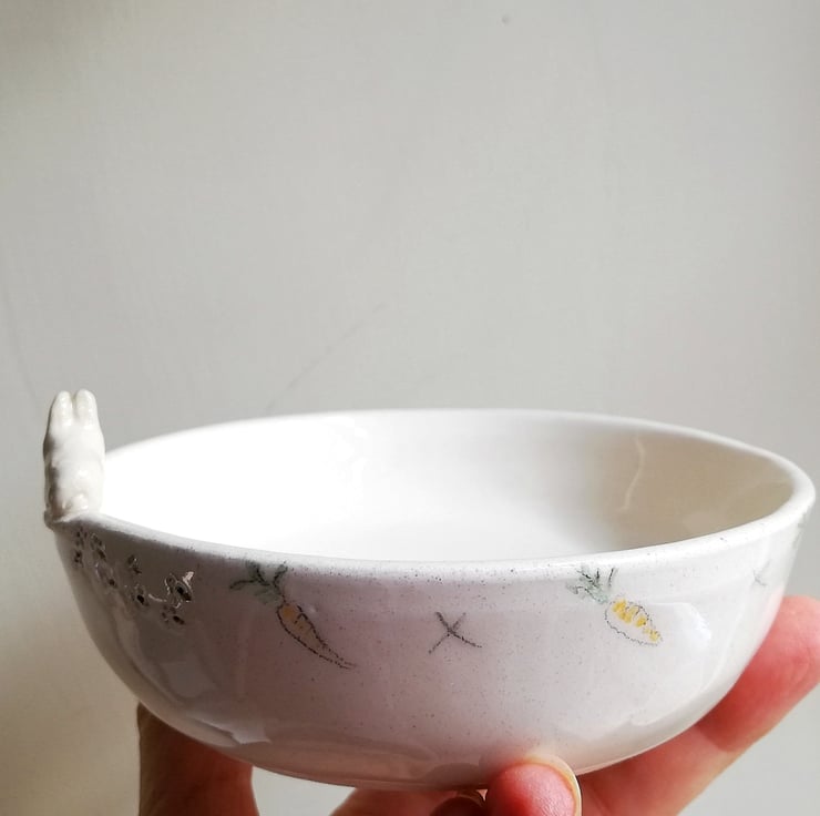 Handmade pottery rabbit bowl with little handpainted carrots, kisses and modelled white rabbit and pawprints. There is a little grey heart on the base of the bowl. Ideal as rabbit feeder or trinket bowl.