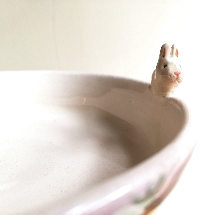 This dish was hand thrown and altered once trimmed to accommodate the tiny bunny. Once bisque fired it was hand painted and glazed in clear lead free glaze prior to final firing.