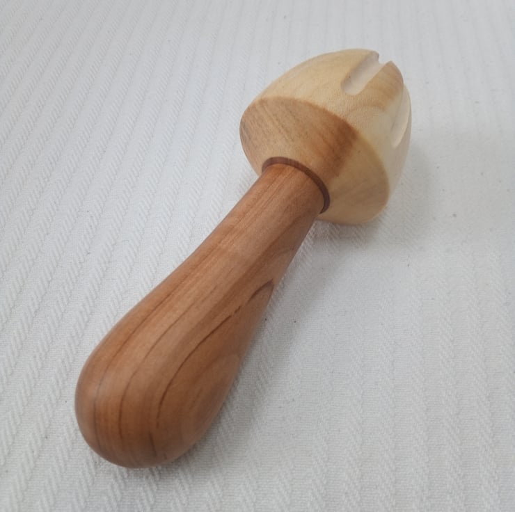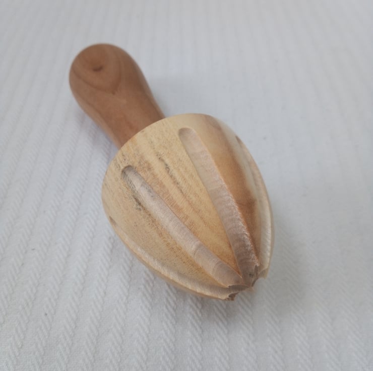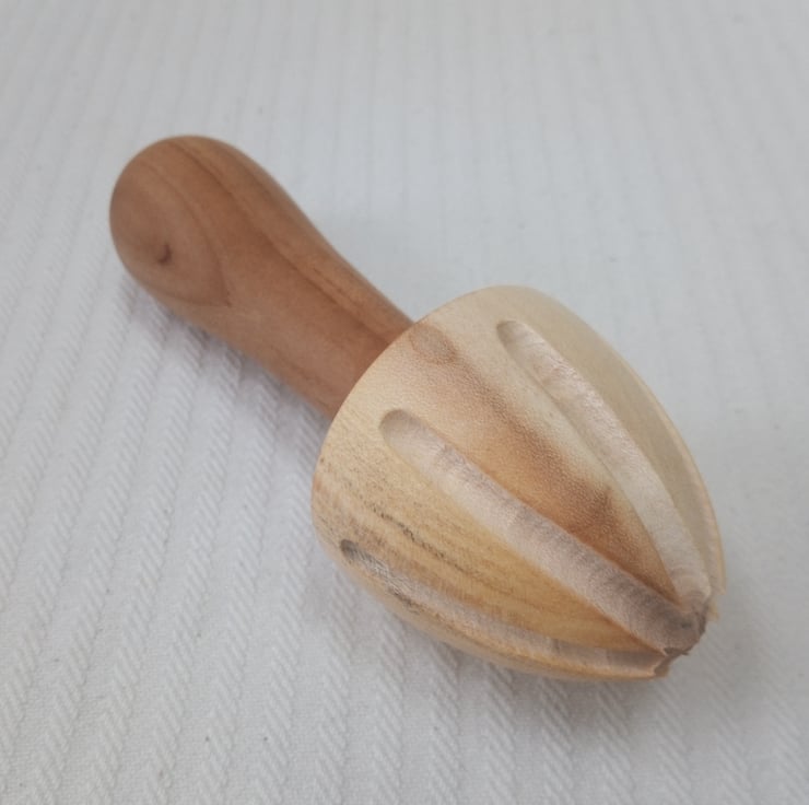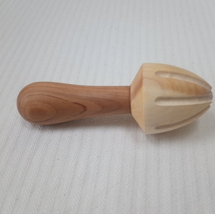 Lemon Grapefruit and general citrus fruit juicer has a great comfy curvaceous Apple Wood handle,wider and longer, for larger hands. The grain is rich golden brown almost chestnut with wonderful little stripes striations and even a ripple running through it.
