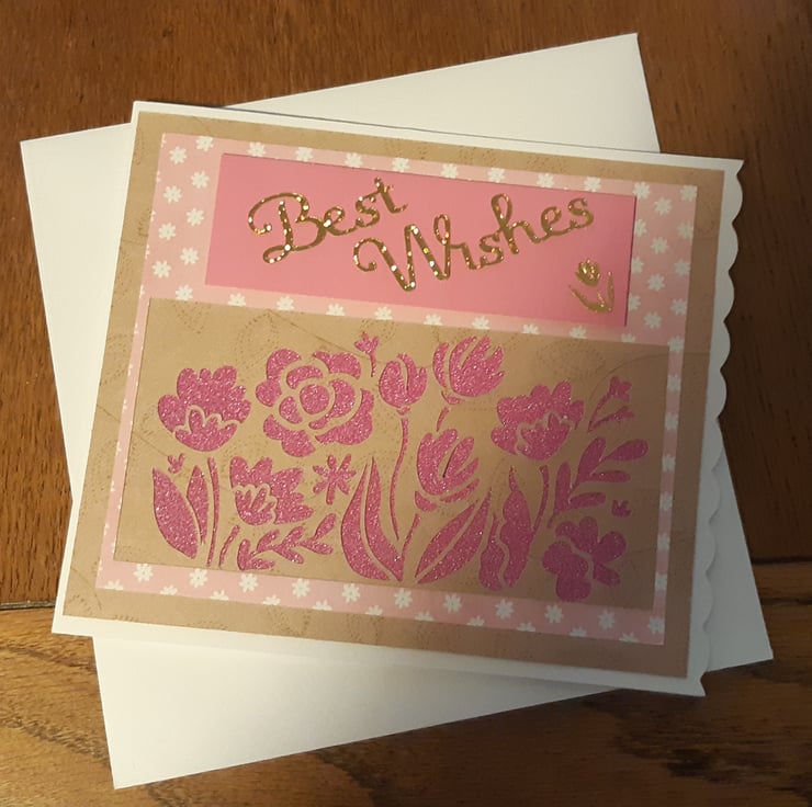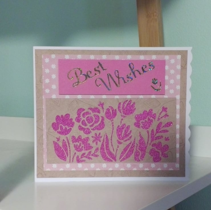 The main floral design has been cut using a machine cut die, layered on top of pretty pink glitter card which has then been framed with pink flower print paper and finished off with the Best Wishes sentiment making this card ideal for birthdays, mothers day or any special occasion.