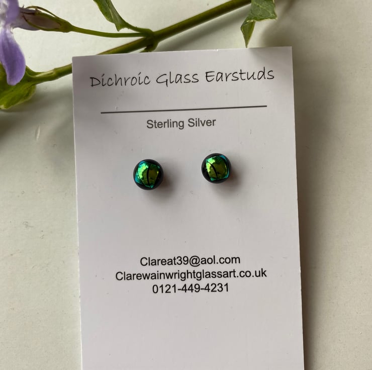 A beautiful pair of fused glass earrings. They have been made using a greeny yellow and black line patterned dichroic glass which has a different transmitted and reflected colour giving a gorgeous effect when looked at from different angles .