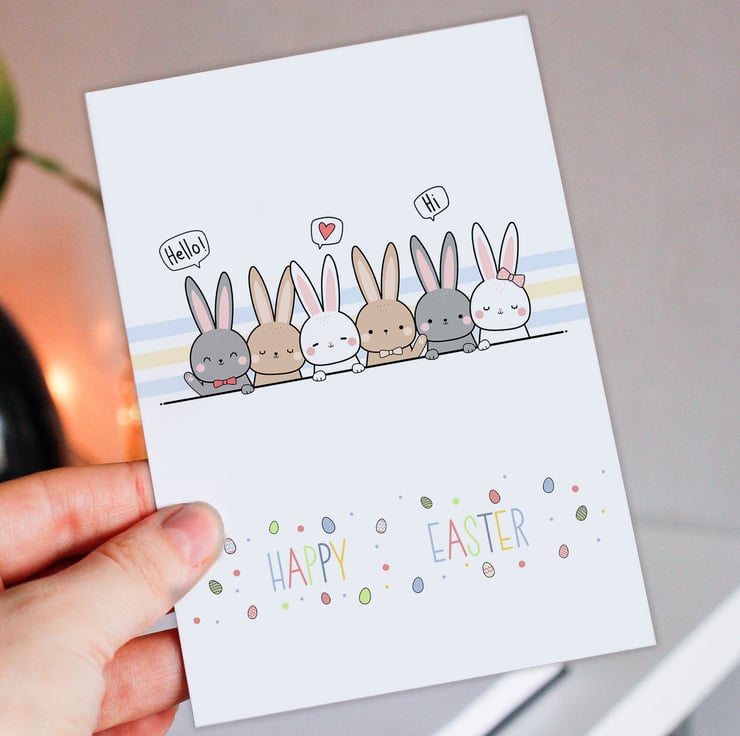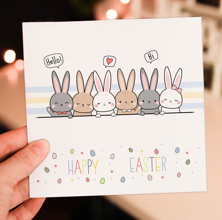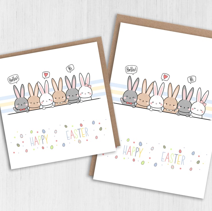Happy Easter card: Bunny rabbits and colourful eggs (Size A6/A5/A4/Square 6x6")