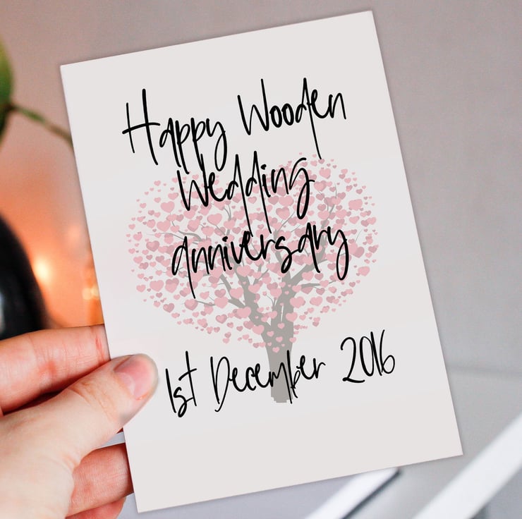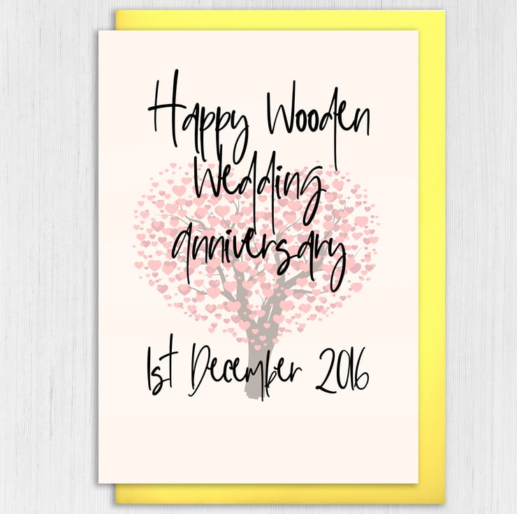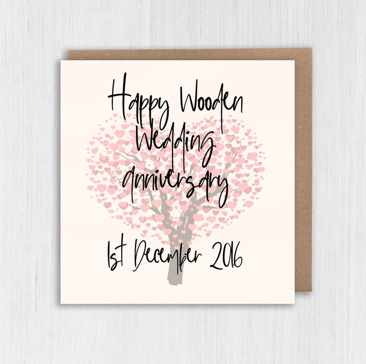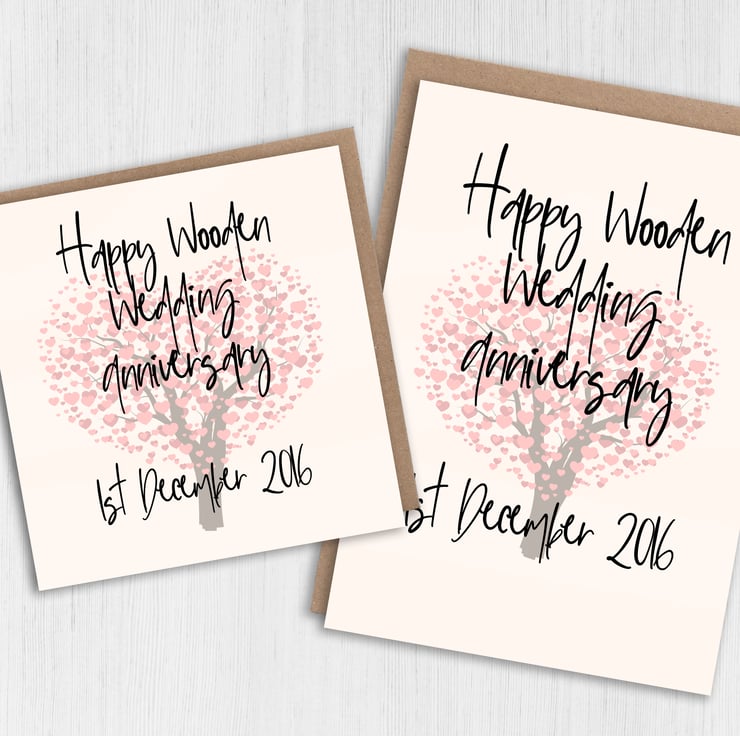 Personalised Wooden (5th/five years) anniversary card: Personalised with date (Size A6/A5/A4/Square 6x6")