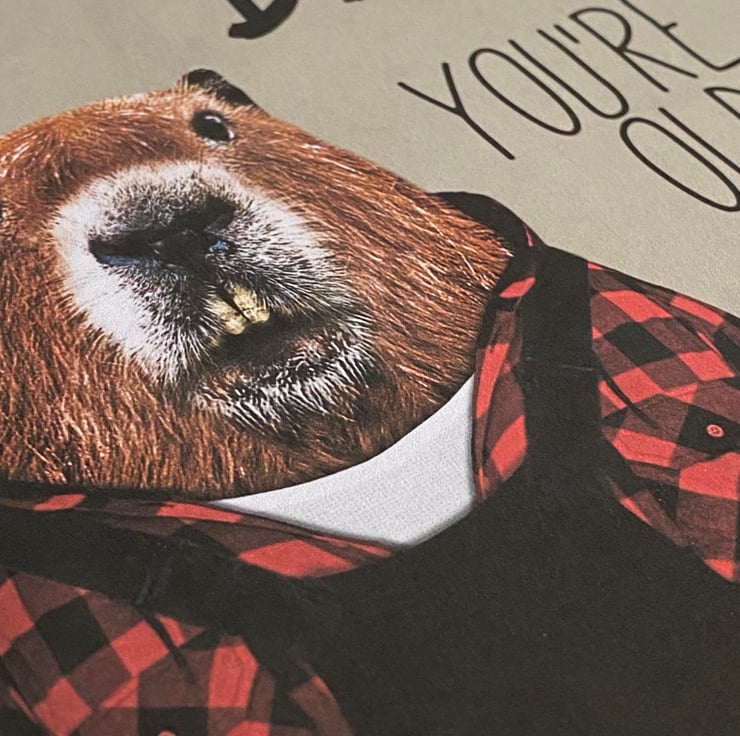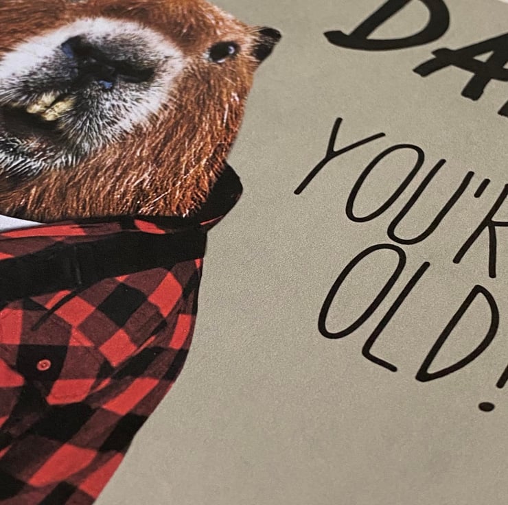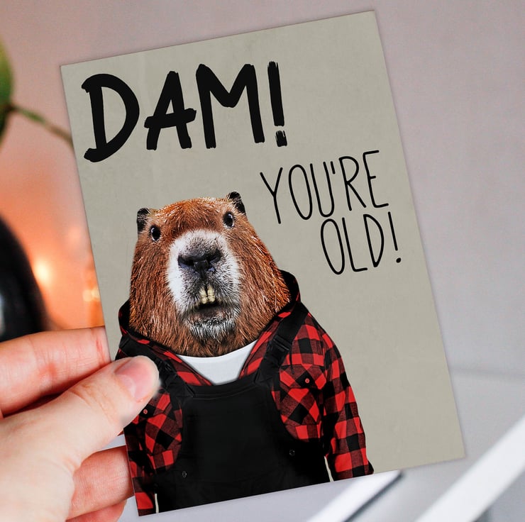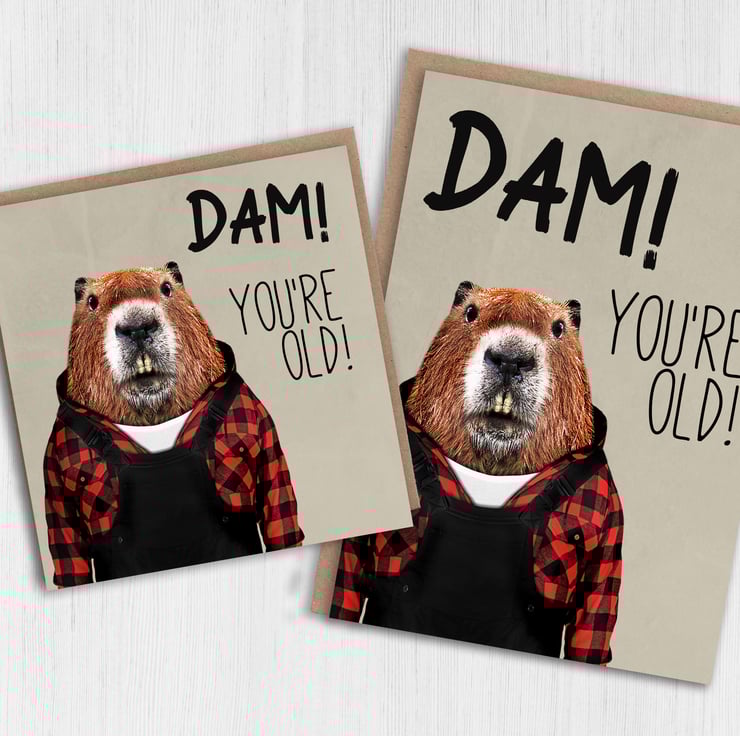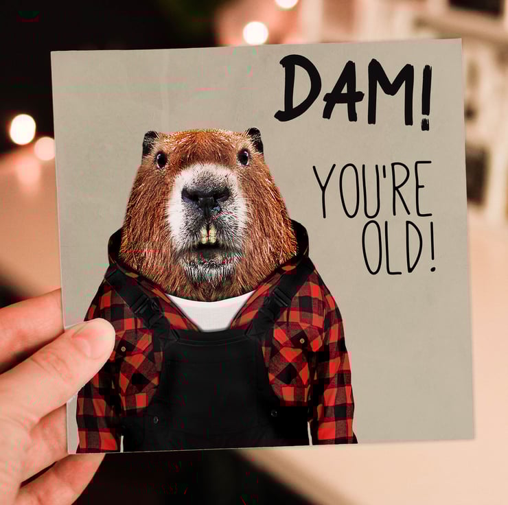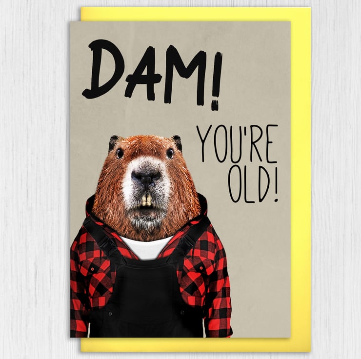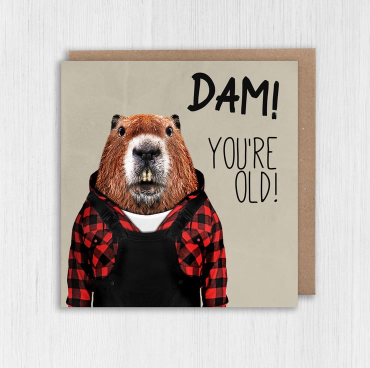 Beaver in clothes old age, pensioner, old person, old man, old lady birthday card: Dam! You're old (Animalyser)