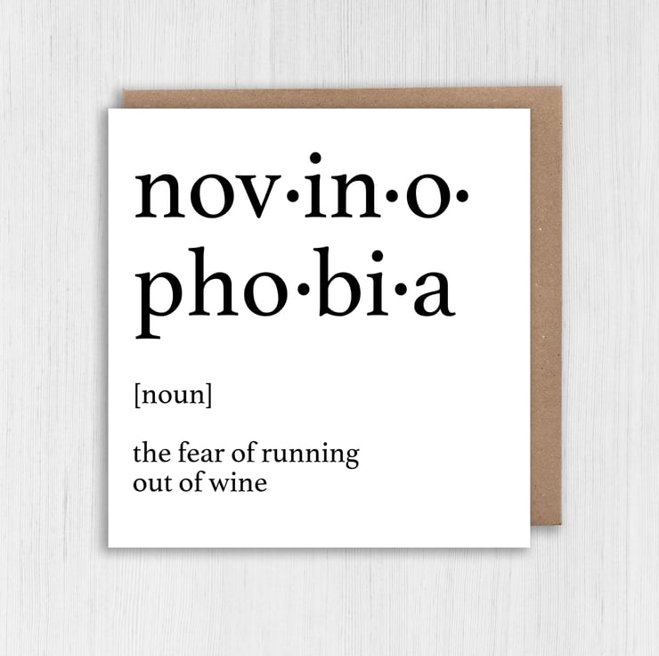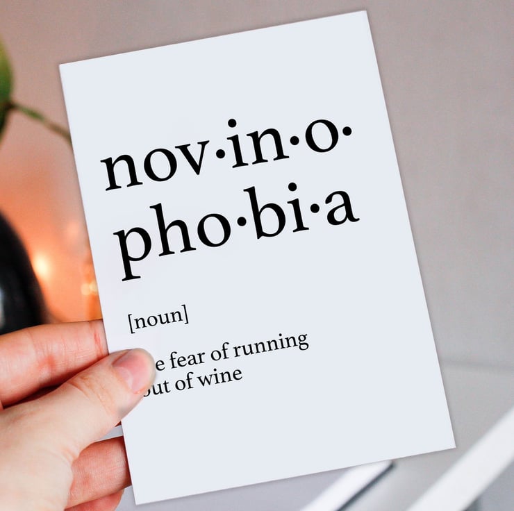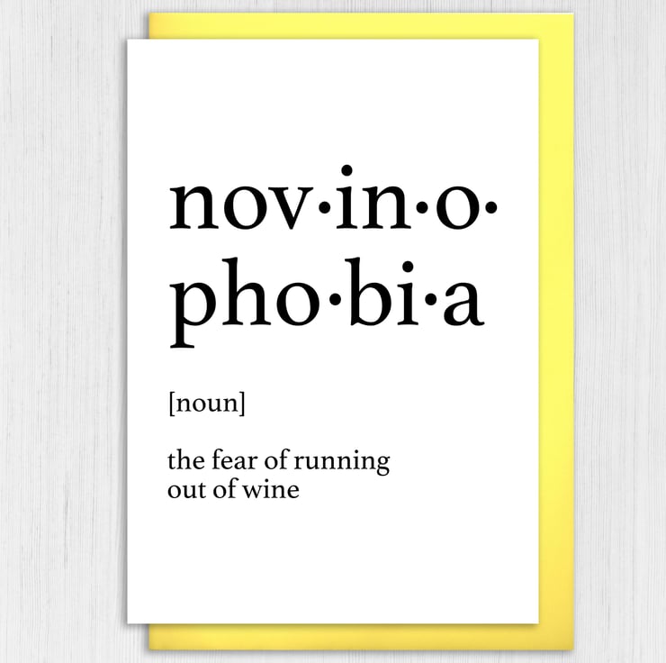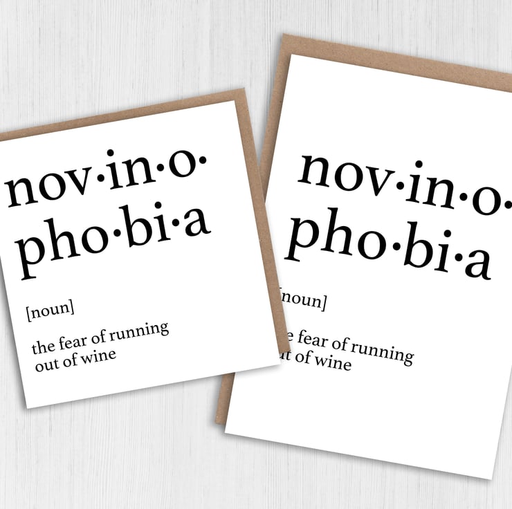 Wine, fear of running out of wine birthday card: Dictionary definition of novinophobia (Size A6/A5/A4/Square 6x6")