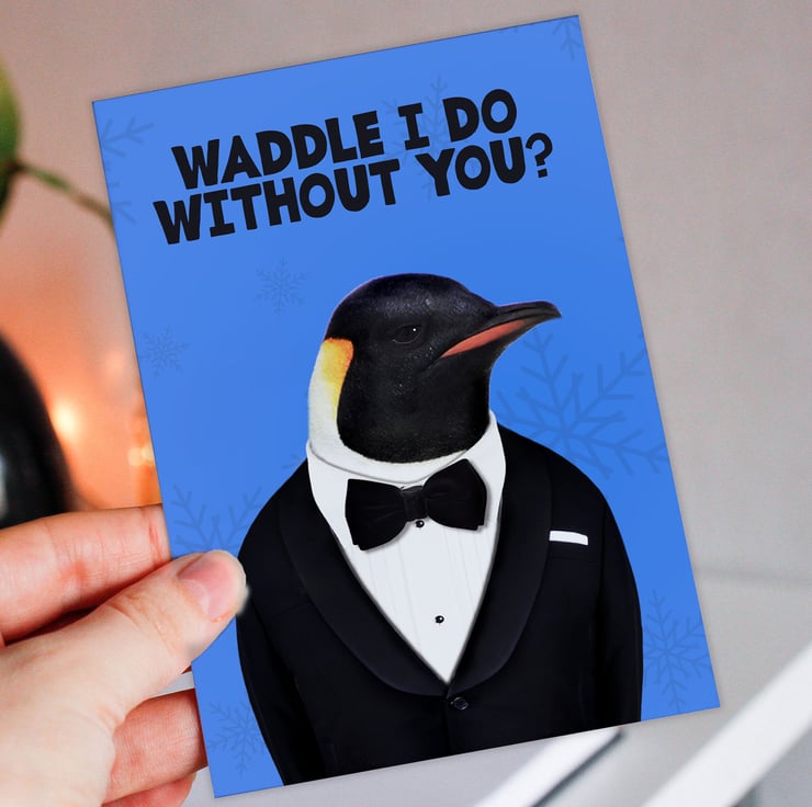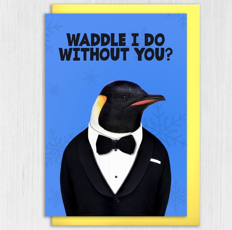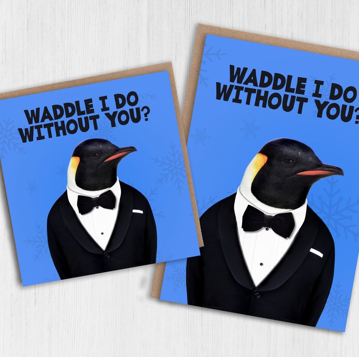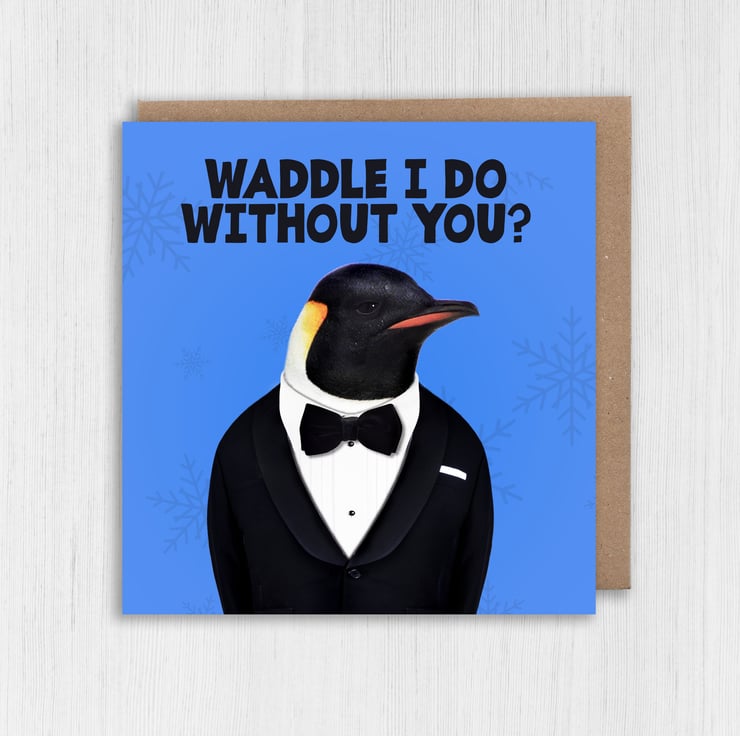 Penguin in clothes anniversary card for wife, husband, girlfriend, boyfriend, partner: Waddle I do without you? (Animalyser)