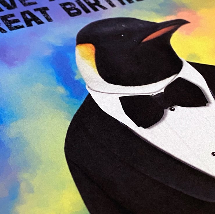 Penguin in clothes rainbow birthday card: Have a flippin' great birthday (Animalyser)