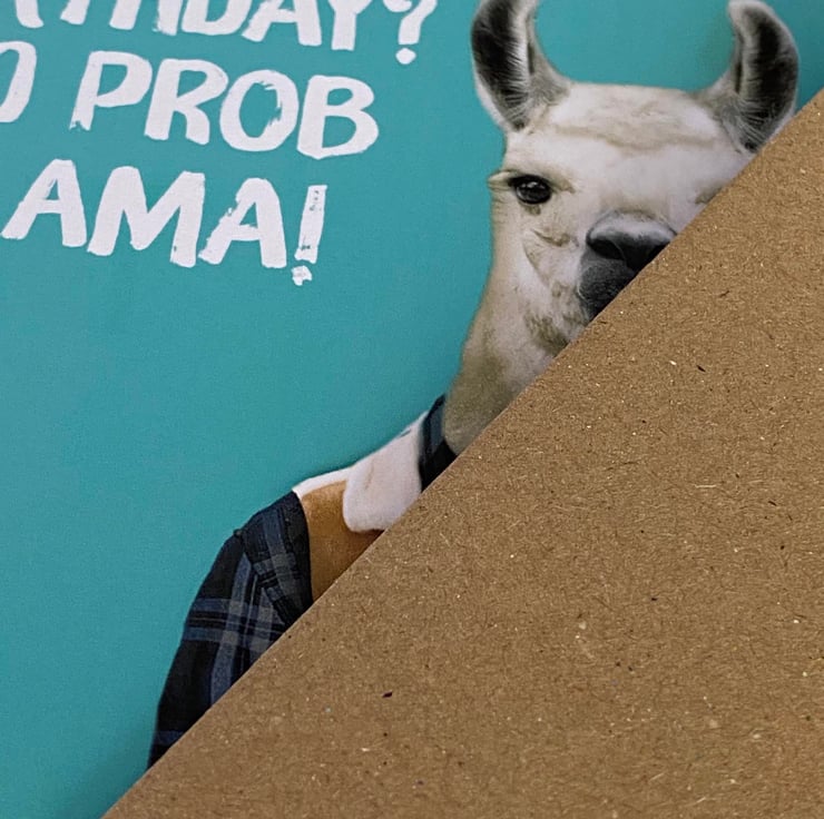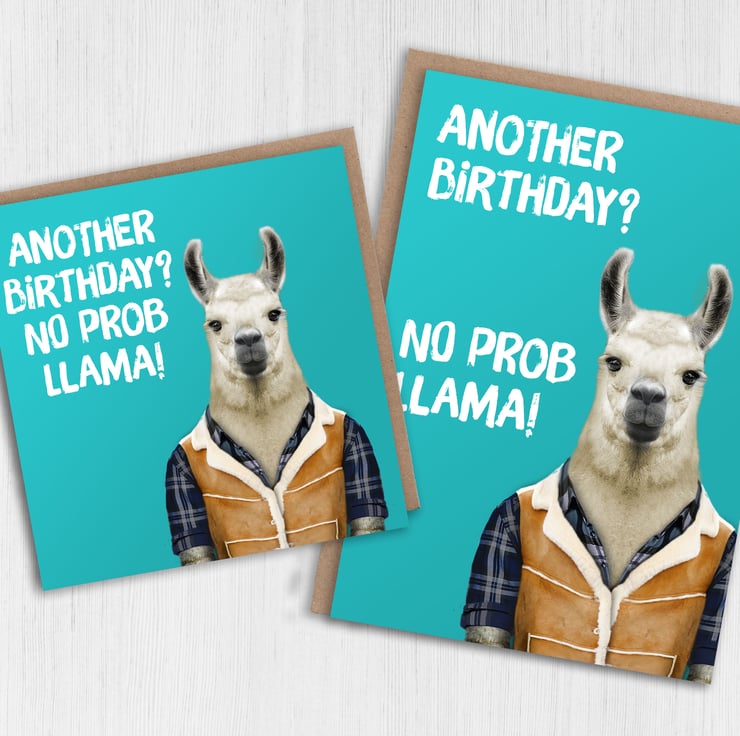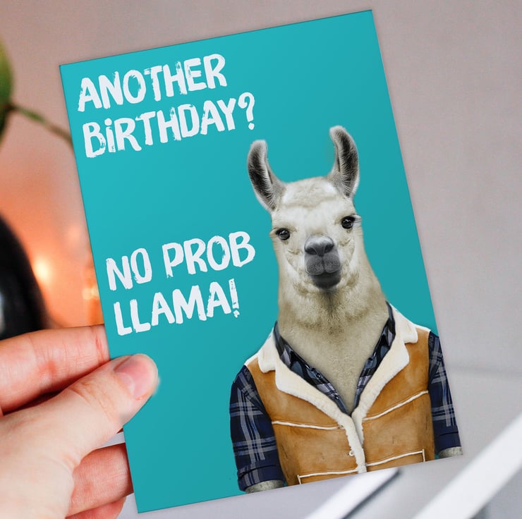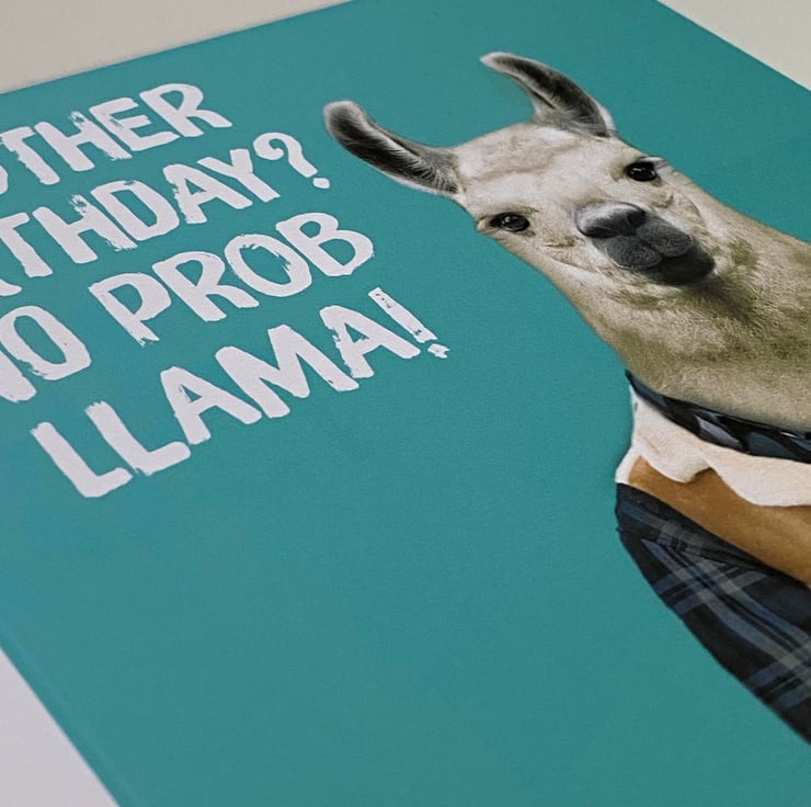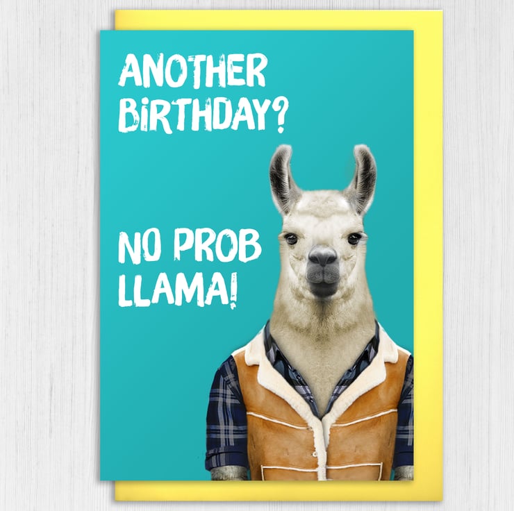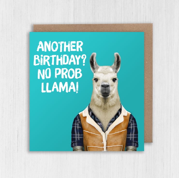 Llama in clothes birthday card: Another birthday? No prob llama (Animalyser)