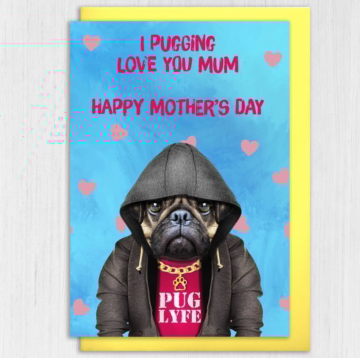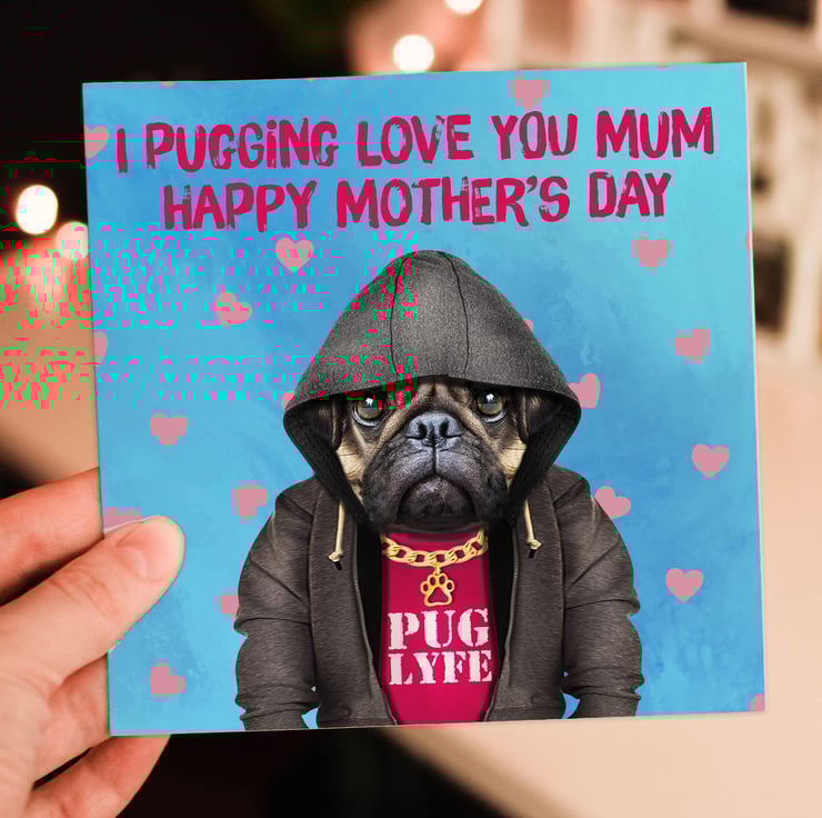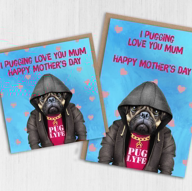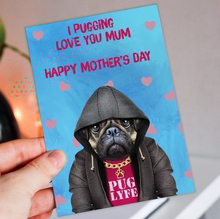 Pug in clothes Mother's Day card for mum, mom, mam, mother: I pugging love you mum, mom (Animalyser)