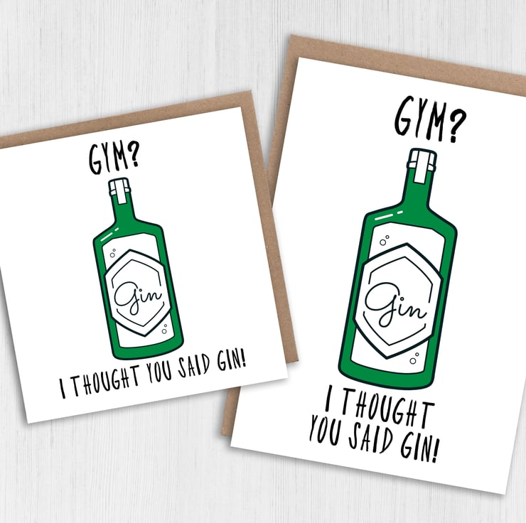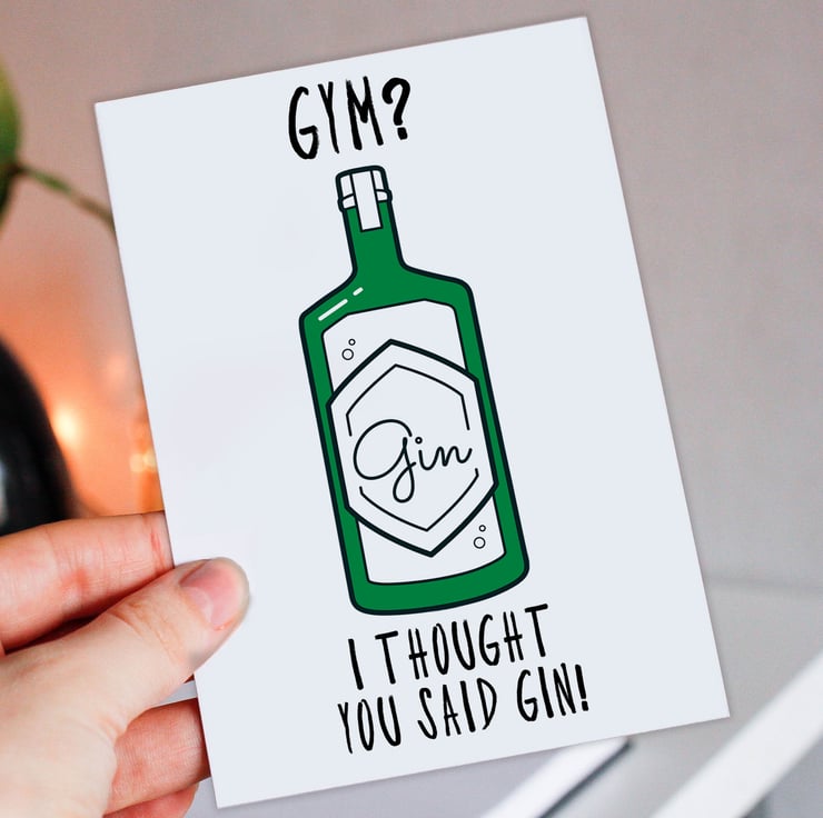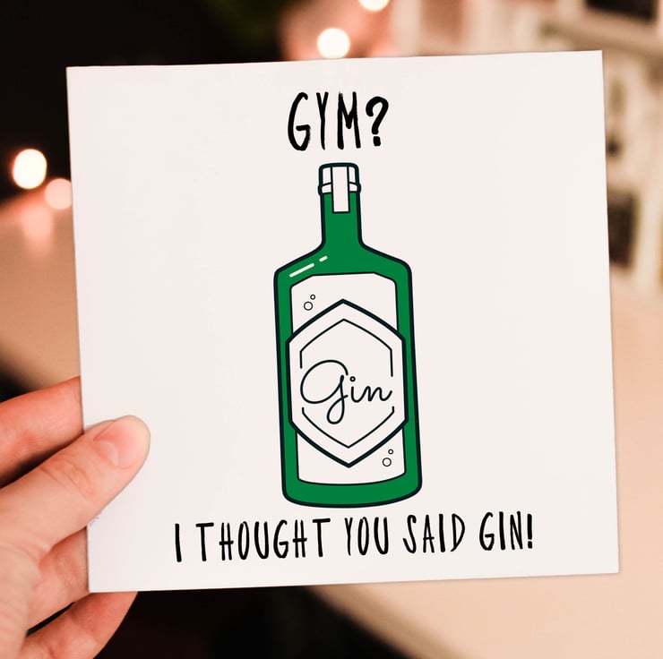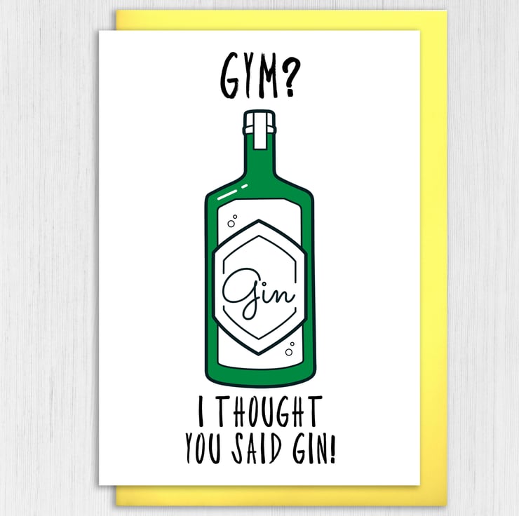 Funny gym, gin, alcohol, workout, Personal Trainer birthday card: Gym? I thought you said gin! (Size A6/A5/A4/Square 6x6")