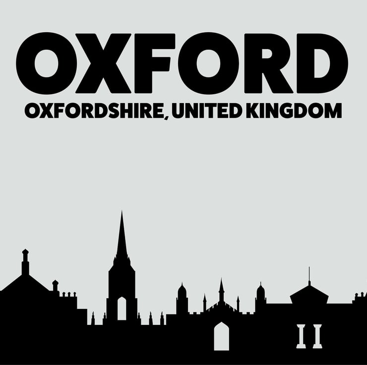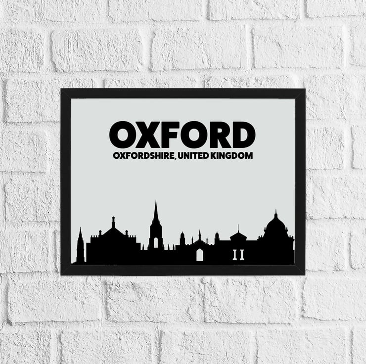 Skyline silhouette of Oxford, Oxfordshire, UK, grey and black print, wall art