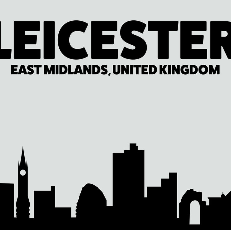 Skyline silhouette of Leicester, East Midlands, UK, grey and black print
