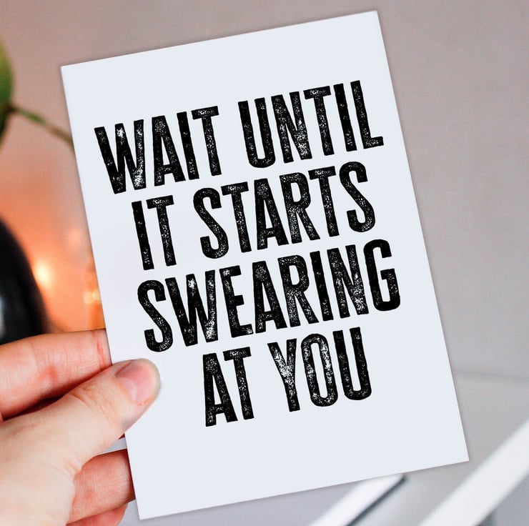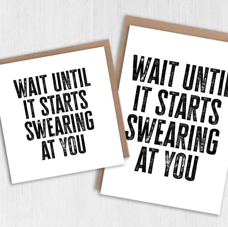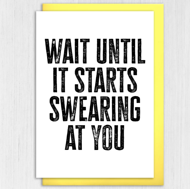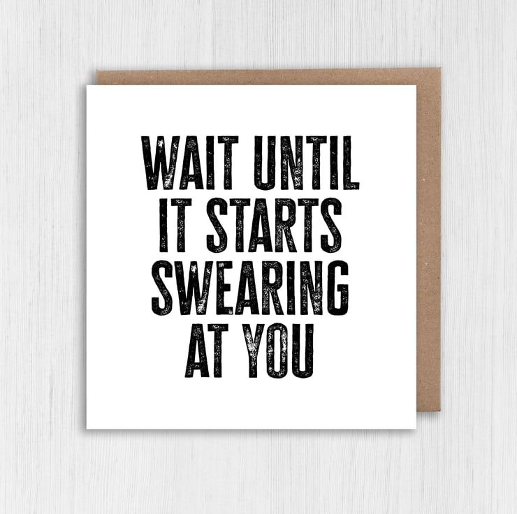 Funny new baby, baby shower, congratulations card: Wait until it starts swearing at you (Size A6/A5/A4/Square 6x6")
