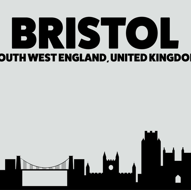 Skyline silhouette of Bristol, South West England, UK, grey and black print