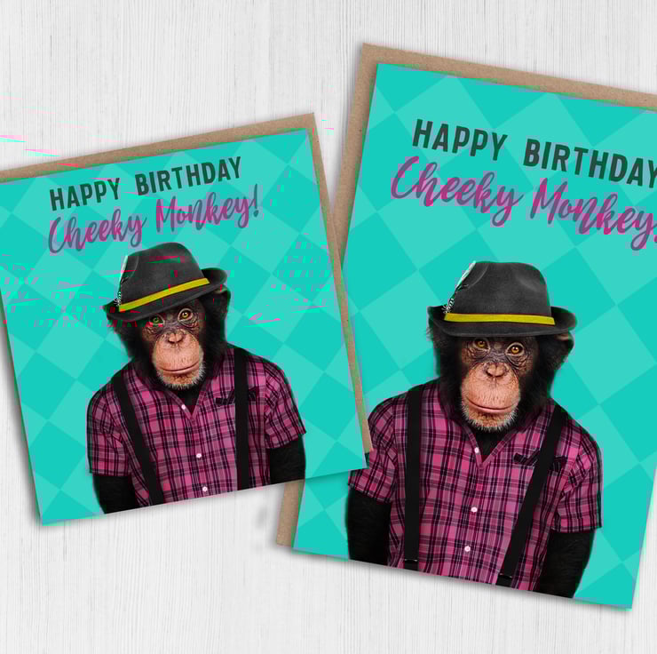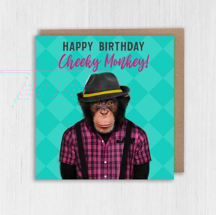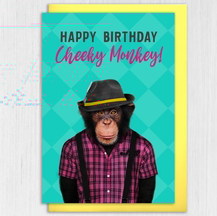Monkey in clothes birthday card - Happy birthday cheeky monkey (Animalyser)