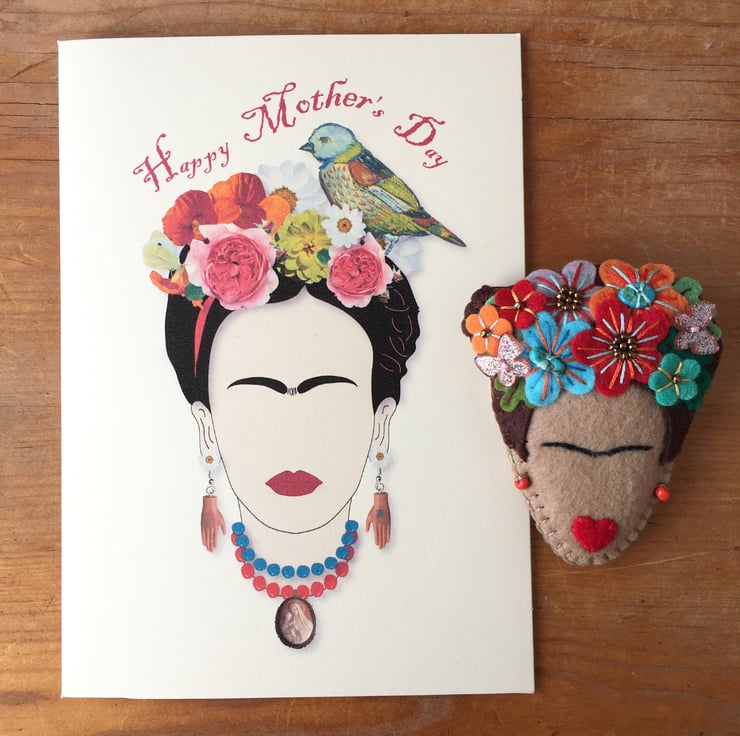 Set of Frida kahlo inspired handmade felt brooch and Mother's day card