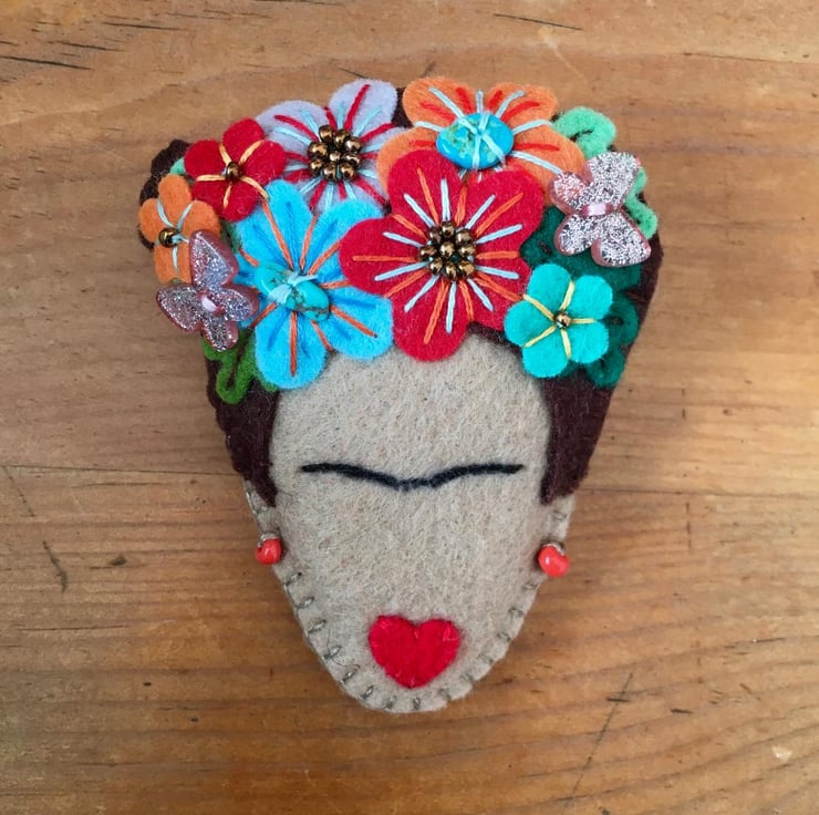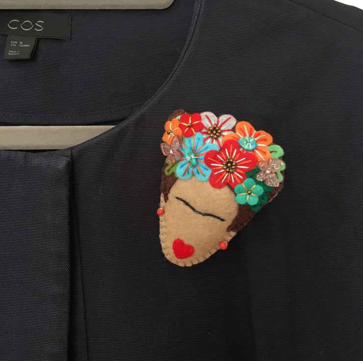 This is for a lovely & pretty Frida kahlo inspired handmade felt brooch that I have used different color beads & vintage buttons to light up the brooch that I individually designed and handcrafted.