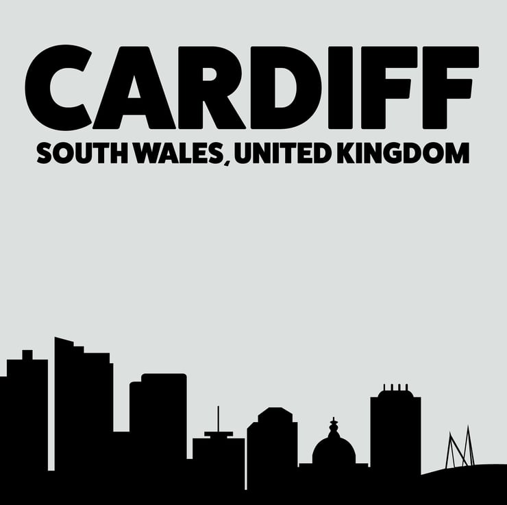 Skyline silhouette of Cardiff, Wales, UK, grey and black print, wall art