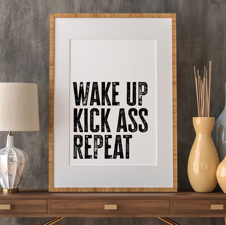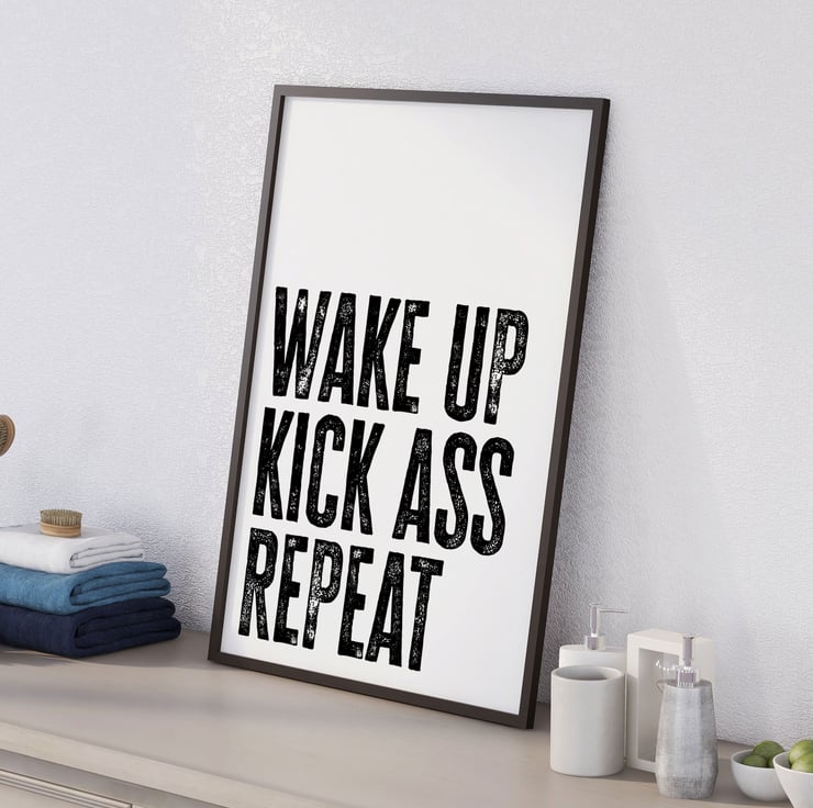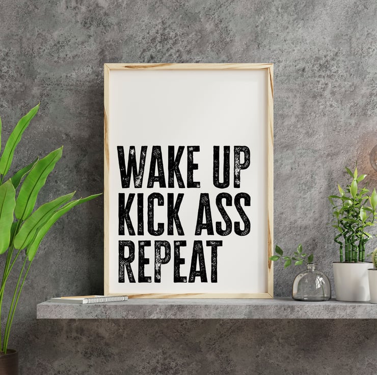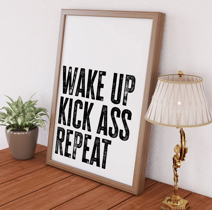 Wake up, kick ass, repeat stamp font typography bedroom print