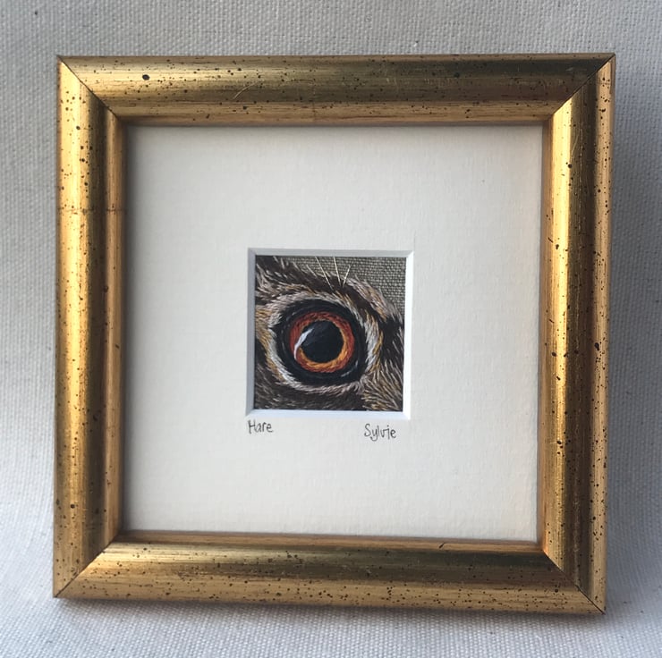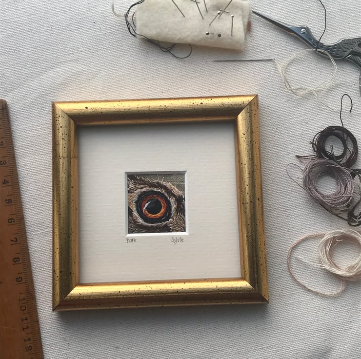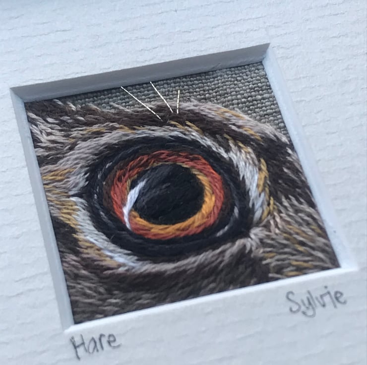 A closeup detailed image of a Hare’s Eye, hand stitched with individual strands of embroidery thread in shades of brown from cream to dark chocolatey umber. The Eye is a ring of golden amber with a deep black pupil and the light is just catching on the dome. There’s a few golden hairs glinting in the light too.