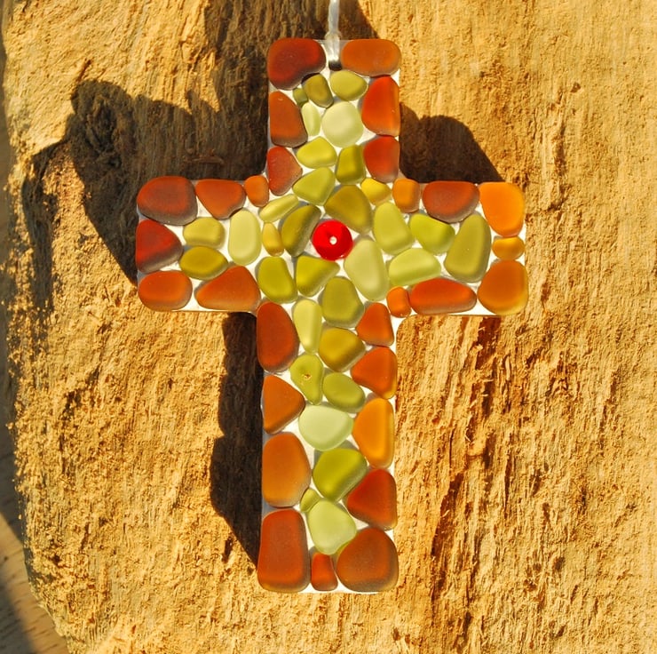 Warm tones of brown and olive green make up this attractive mosaic. The centre of the cross is a red glass bead. The glass has come from old bottles, so the pieces are slightly curved. We have tumbled the beach glass until it is beautifully rounded, giving the mosaic a three dimensional effect. The back of the hanger is laser cut plywood with an attractive brown edge.