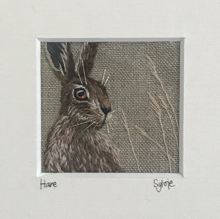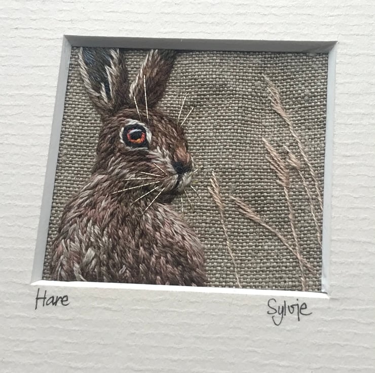 This textile piece was stitched with individual strands of embroidery thread onto a cotton background. The watchful eye is bright amber and there are gold thread whiskers glinting in the light. The Hare looks alert amongst the tall meadow grasses.
