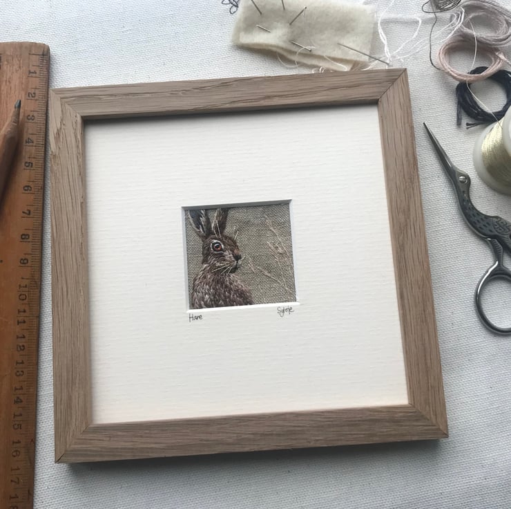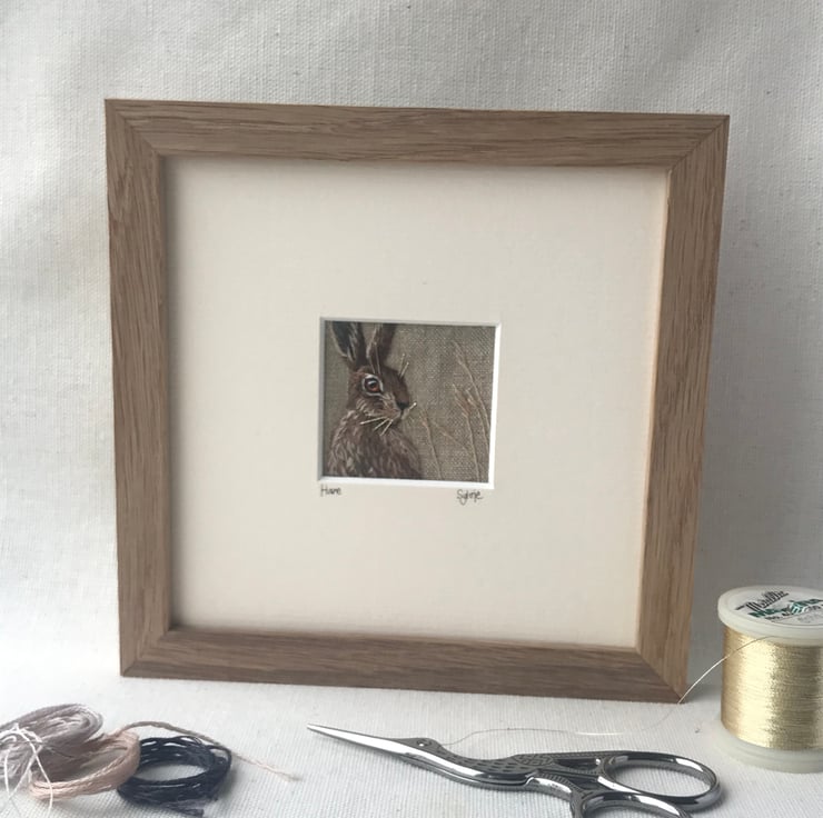 A detailed study of a wild Hare, embroidered by hand and framed in oak.