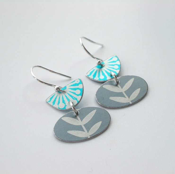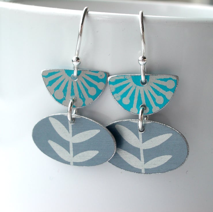 These tulip shaped folk art style flower and leaf earrings are made from anodised aluminium which I have dyed in turquoise and grey and printed with a leaf print. The dye is made permanent by heating the aluminium. I have cut out the semi-circle and pod shape with a piercing saw and filed the edges for a nice smooth finish. The two pieces are linked with a sterling silver hoop and dangle from a sterling silver ear wire. The semi-circle and pod shape together both measure approximately 25mm from top to bottom and the widest part of the pod measures 20mm across