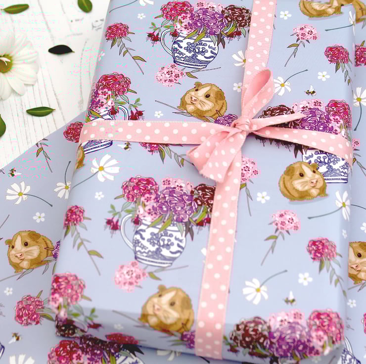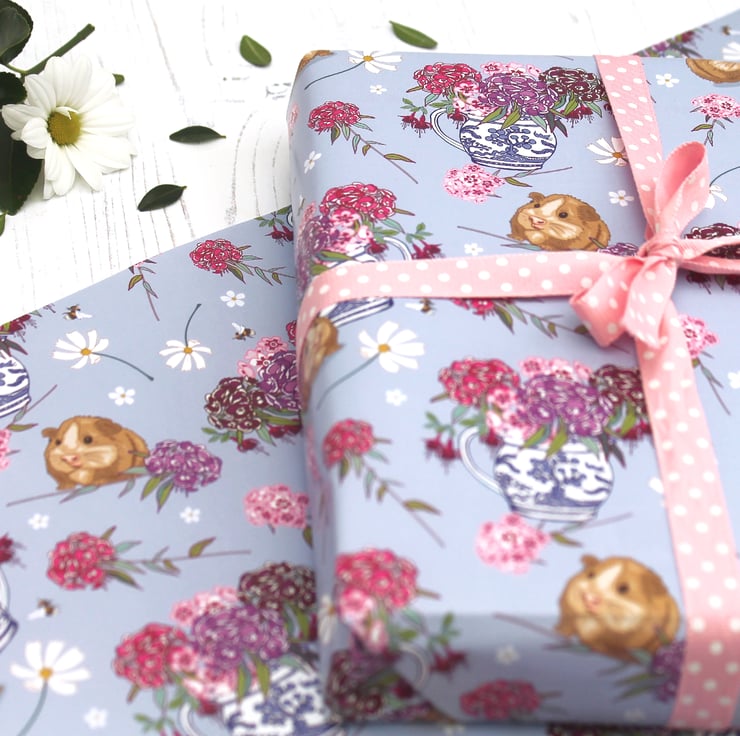 Fun and friendly little guinea pig is delighted with the sight of all the Sweet William flowers from the garden filling the blue willow jugs.