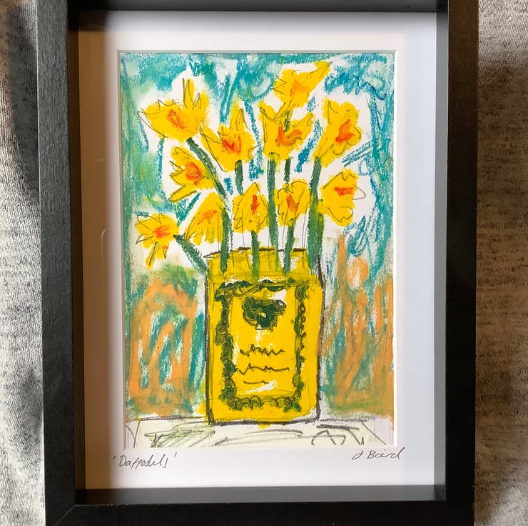 This is an original oil pastel drawing, mounted and framed in black. Image is 5x7 inches.