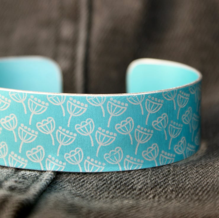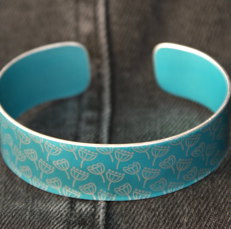 A quirky bracelet/narrow cuff made from anodised aluminium with a mini print of seed heads. I drew this pattern digitally, made it into a resist and applied it to the metal. I then dye the aluminium, seal it and remove the resist which leaves the pattern showing in the original colour of the metal. The cuff is then made using traditional metalworking techniques.