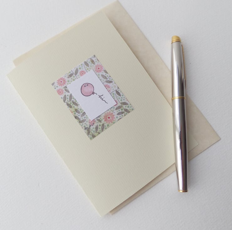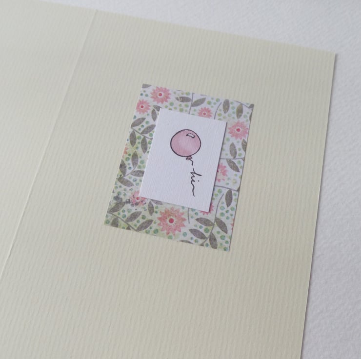 A hand stamped cute balloon, individually coloured with the word 'hi' in the string: