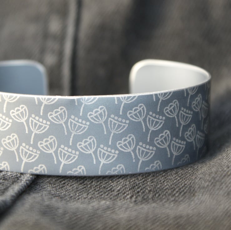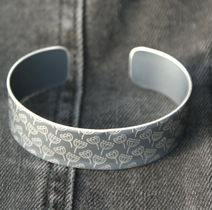 A quirky bracelet/narrow cuff made from anodised aluminium with a mini print of seed heads. I drew this pattern digitally, made it into a resist and applied it to the metal. I then dye the aluminium, seal it and remove the resist which leaves the pattern showing in the original colour of the metal. The cuff is then made using traditional metalworking techniques.