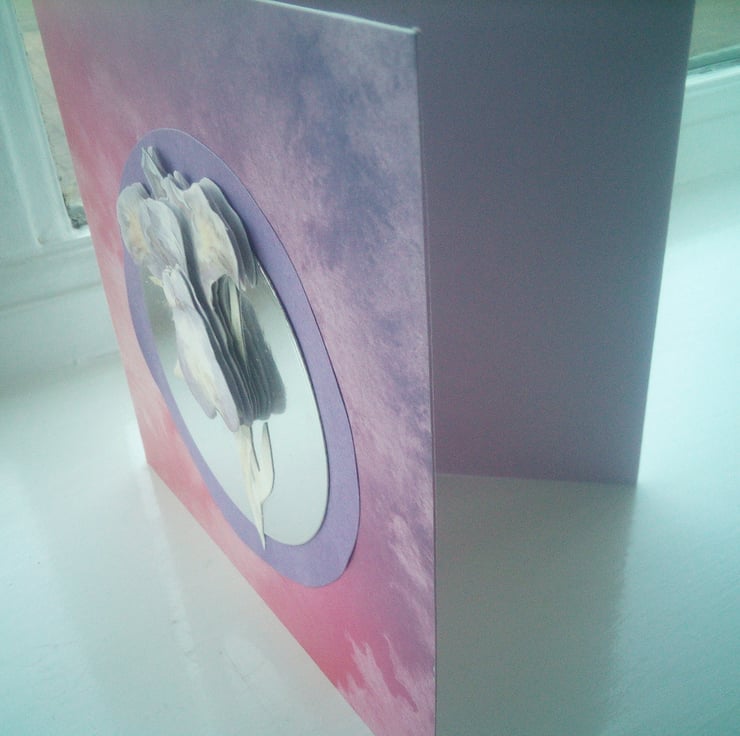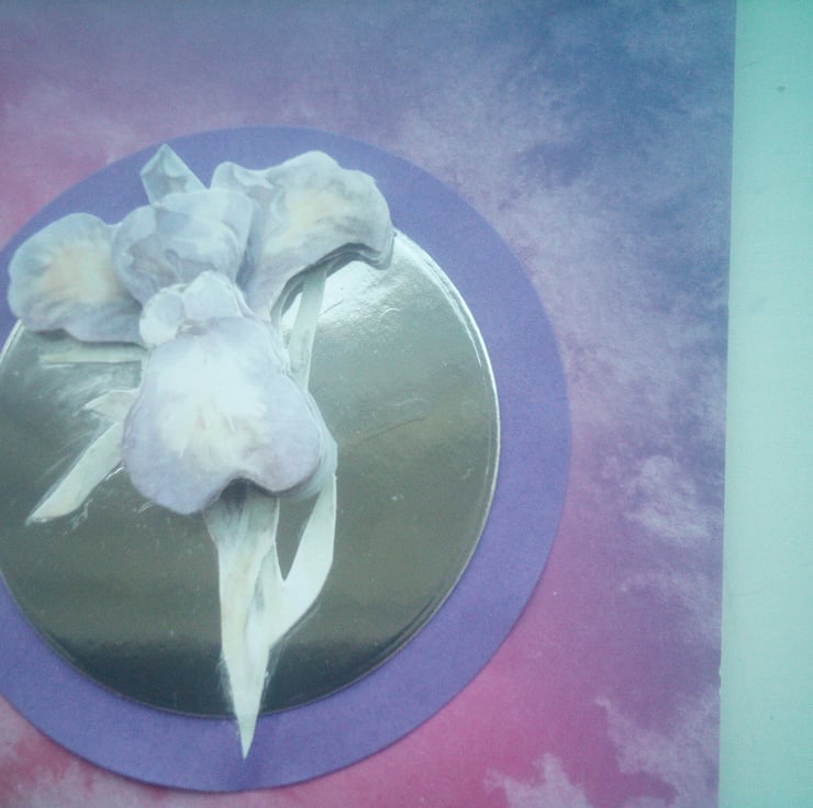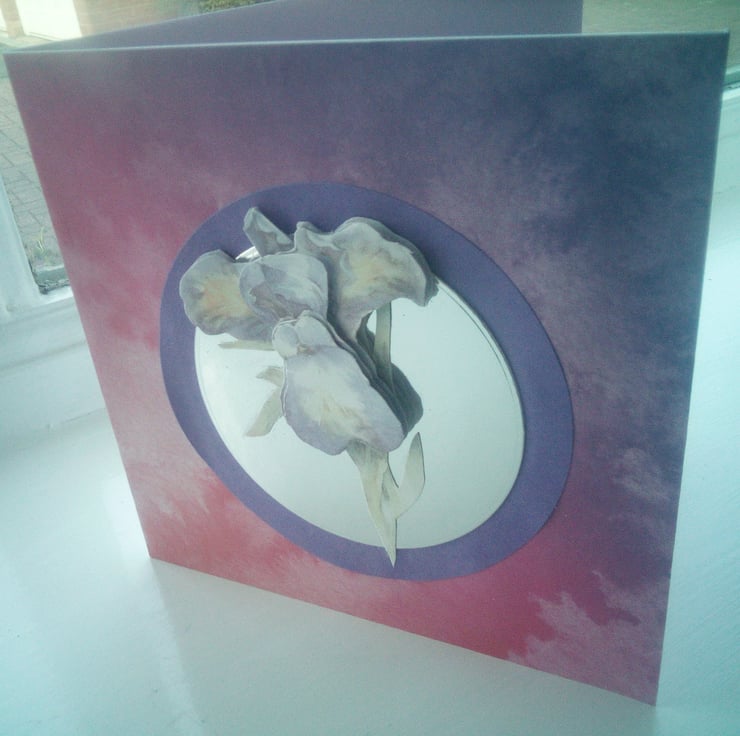 A completely handmade and uniquely designed card. Consisting of a stunning iris decoupage mounted onto a circle of silver mirri then a circle of purple card then onto pink/lilac swirly card and finally onto pristine white quality card