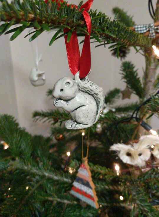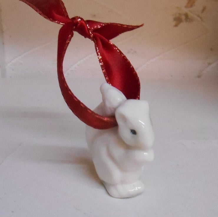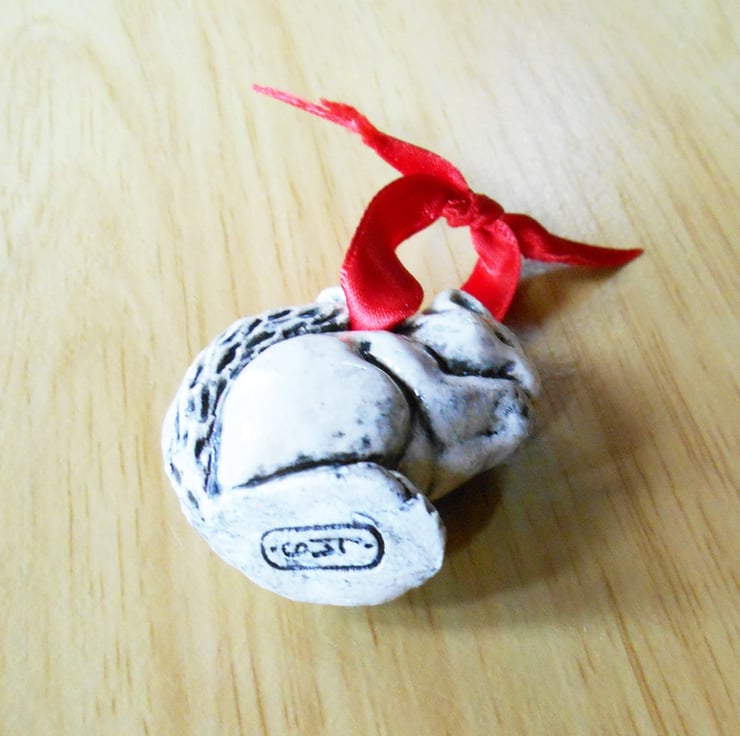 They have a hole through the tail and a ribbon (differing colours) has been threaded through for hanging. They are petite and measure 3 cm high.